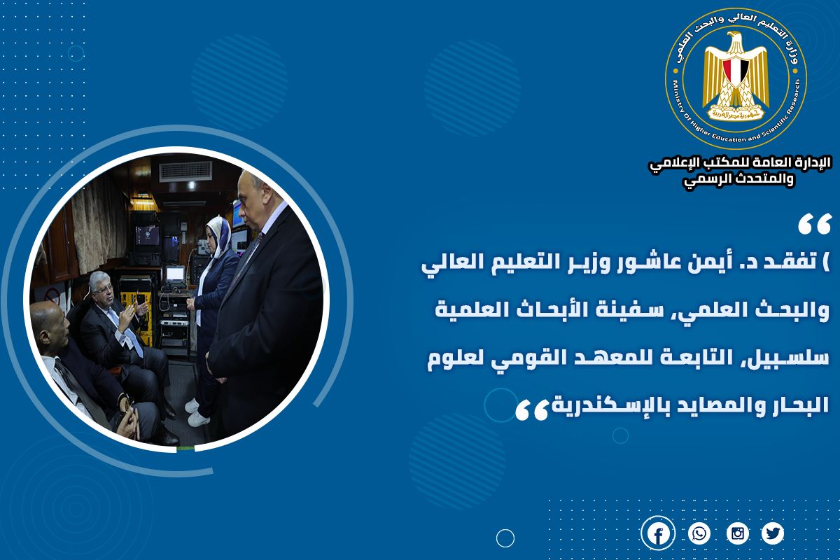 8) تفقد الدكتور أيمن عاشور وزير التعليم العالي والبحث العلمي، سفينة الأبحاث العلمية سلسبيل، التابعة للمعهد القومي لعلوم البحار والمصايد بالإسكندرية، ووجه الوزير بأهمية الاستفادة من السفينة في إجراء الدراسات والبحوث العلمية وخاصة الأبحاث المُتعلقة بالتغيرات المناخية، وقياس مدى الآثار المتوقعة الناجمة عن هذه التغيرات، مشيرًا إلى ضرورة استمرار قيام السفينة بالرحلات سواء بغرض الصيد أو الرحلات الاستكشافية العلمية.