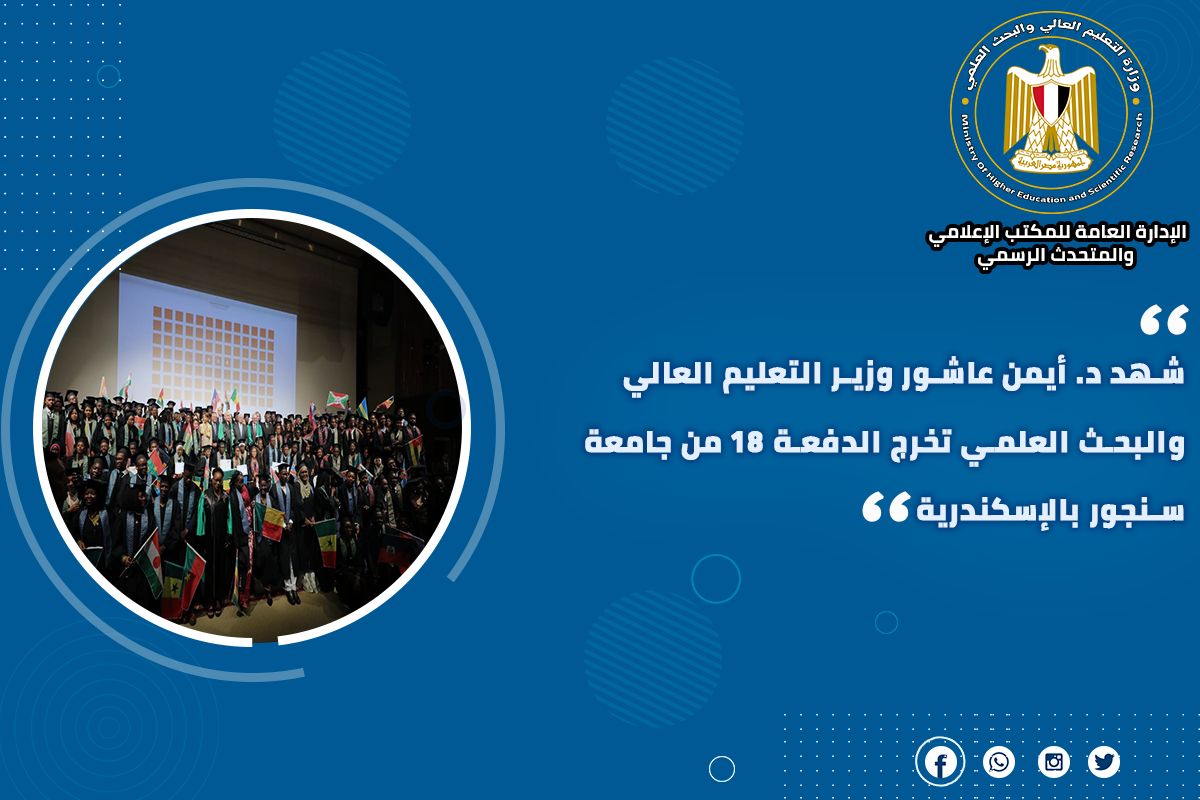 9) شهد الدكتور أيمن عاشور وزير التعليم العالي والبحث العلمي تخرج الدفعة 18 من جامعة سنجور بالإسكندرية، وأشار الوزير إلى الدور الهام الذي تقدمه الجامعة في إعداد الكوادر المُتميزة المُتخصصة في قضايا التنمية، وتساهم في تعزيز التواصل الثقافي بين الطلاب من مختلف الدول وهو ما يتواكب مع السياسة الخارجية المصرية لدعم جهود التنمية في القارة الإفريقية وزيادة التفاعل الإيجابي بين شعوبها.