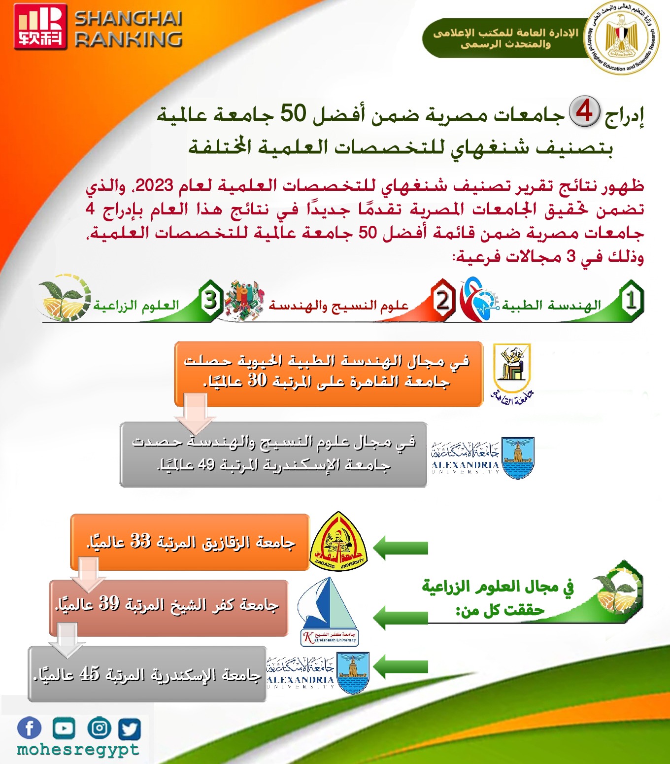 وأشار وزير التعليم العالي والبحث العلمي، إلى ظهور نتائج تقرير تصنيف شنغهاي للتخصصات العلمية لعام 2023، والذي تضمن تحقيق الجامعات المصرية تقدمًا جديدًا في نتائج هذا العام بإدراج 4 جامعات مصرية ضمن قائمة أفضل 50 جامعة عالمية للتخصصات العلمية، وذلك في 3 مجالات فرعية، وهى (الهندسة الطبية، وعلوم النسيج، والعلوم الزراعية)، وبيانها كالآتي: