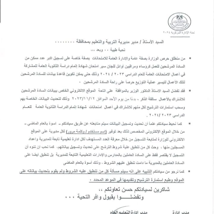 أعلنت لجنة الإدارة المركزية بوزارة التربية والتعليم والتعليم الفني، أنه من منطلق الحرص على تسجيل أكبر عدد ممكن من المرشحين للعمل كرؤساء ومراقبين أوائل للجان سير امتحان شهادة إتمام دراسة الثانوية العامة للمشاركة في أعمال الامتحانات للعام الدراسي الجاري 2023/2024، وذلك حتى يمكن تكوين قاعدة بيانات للمرشحين لتلك الأعمال لتيسير عملية التوزيع حرصا على راحة المرشحين.