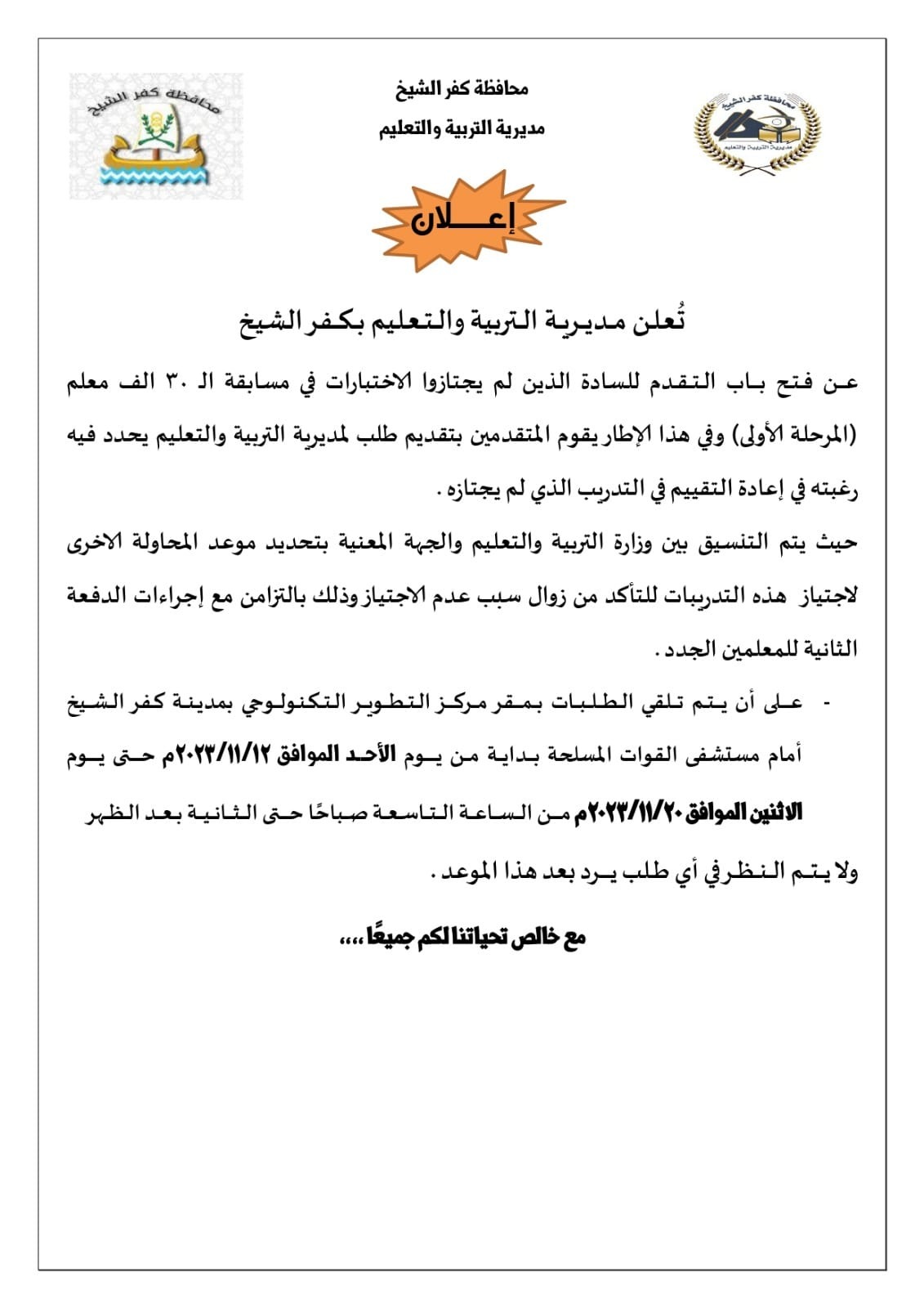 أعلنت مديرية التربية والتعليم والتعليم الفني بمحافظة كفرالشيخ، عن فتح باب التقدم للذين لم يجتازوا الاختبارات في مسابقة الـ30 ألف معلم (المرحلة الأولى) وفي هذا الإطار يقوم المتقدمين بتقديم طلب لمديرية التربية والتعليم يحدد فيه رغبته في إعادة التقييم في التدريب الذي لم يجتازه.