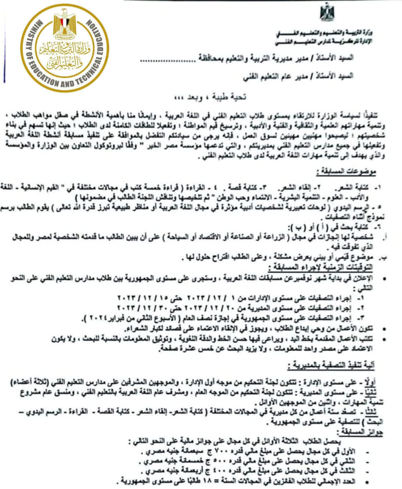 الإعلان في بداية شهر نوفمبر عن مسابقات اللغة العربية، وستجرى على مستوى الجمهورية بين طلاب مدارس التعليم الفني على النحو التالي: