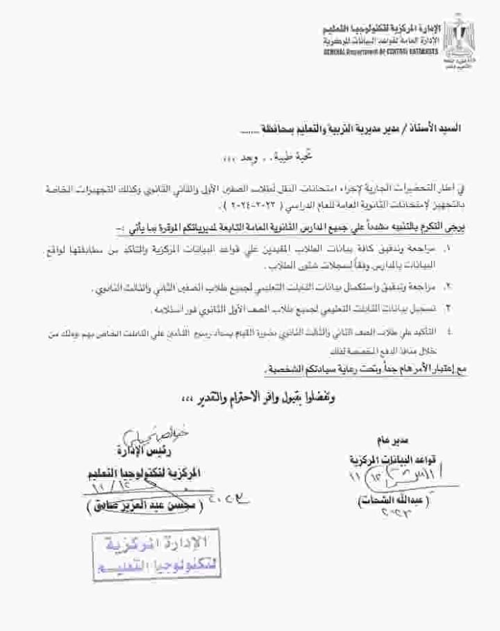 ووجهت الوزارة في خطاب عممته على المديريات التعليمية بالمحافظات بالتنبيه على مديري مدارس الثانوية العامة بتنفيذ الىتي: