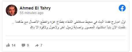 وكتب الطاهري عبر حسابه الشخصي «فيس بوك»: «أول إمبارح فقدنا البث في محيط مستشفى الشفاء بقطاع غزة وانقطع الاتصال مع طاقمنا.. علمت الآن بنبأ استشهاد المصور وإصابة زميل آخر ولا حول ولا قوة إلا بالله».