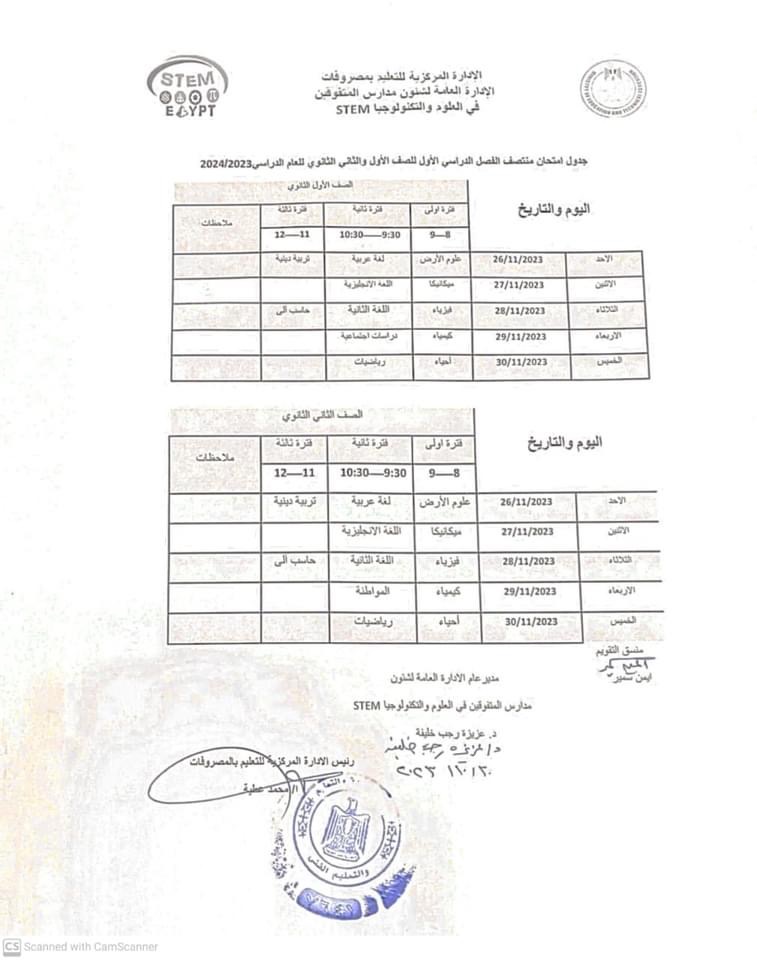 وأوضحت أنه بالنسبة لجدول الصف الأول الثانوي بمدارس المتفوقين، يؤدب الطلاب يوم 26 نوفمبر امتحانات مواد علوم الأرض ولغة عربية وتربية دينية و27 نوفمبر مادتي الميكانيكا واللغة الإنجليزية و28 نوفمبر امتحان مواد الفيزياء واللغة الثانية والحاسب الآلي، و29 نوفمبر الكيمياء والدراسات الاجتماعية و30 نوفمبر مادتى الأحياء والرياضيات.