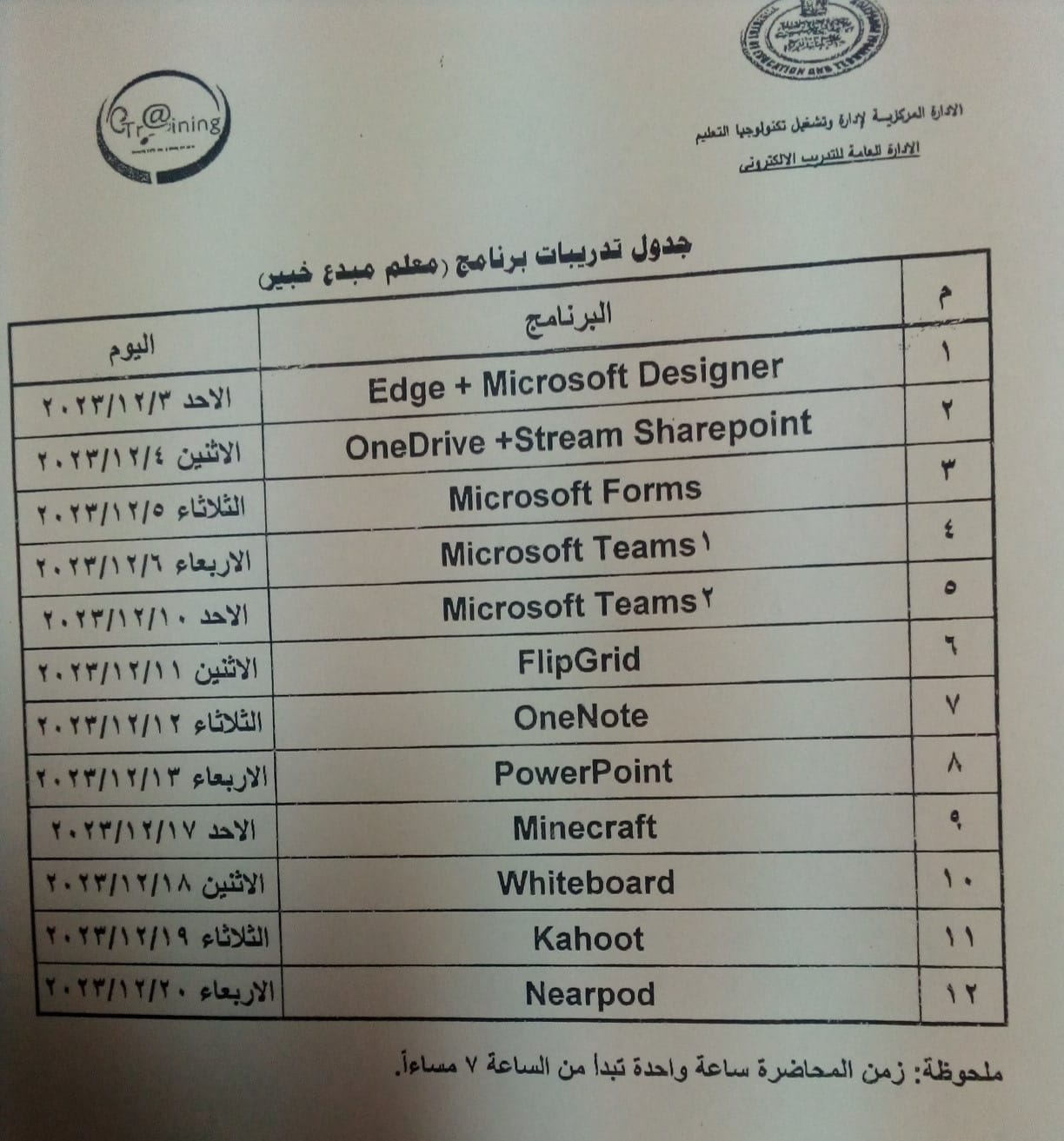 وأوضحت أنه سيتم تنفيذ التدريب للمتقدمين عن كيفية أن تصبح معلم ميكروسوفت المبدع "الخبير من خلال المنصة الإلكترونية للتدريب والتطوير المهني للمعلمين (CPD ويتضمن التدريب كل البرامج التي تؤهل المعلم للتقدم للحصول على هذا اللقب وفق الجدول الآتي: