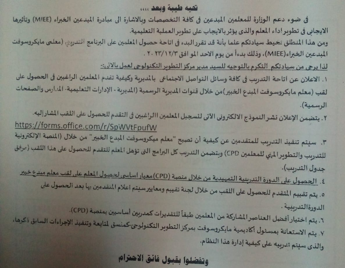 - الإعلان عن اتاحة التدريب في كافة وسائل التواصل الاجتماعي بالمديرية وكيفية تقدم المعلمين الراغبين في الحصول على لقب (معلم) مايكروسوفت المبدع (الخبير من خلال قنوات المديرية الرسمية (المديرية - الإدارات التعليمية - المدارس والصفحات الرسمية).