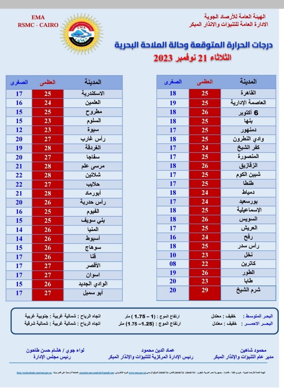 وتابعت عضو المركز الإعلامي لهيئة الأرصاد الجوية، أنه سيكون هناك فرصة لسقوط الأمطار الخفيفة على لمحافظانت الساحلية، ولكنها ستكون غير مؤثرة على الأنشطة اليومية، مؤكدة أن درجات الحرارة حول المعدلات الطبيعية، وستستجل درجات الحرارة ما بين 25 و26 درجة مئوية.