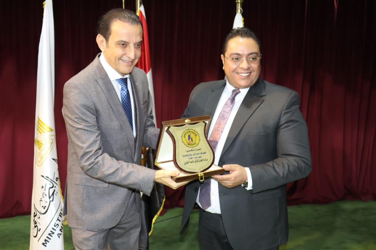 وفي نهاية اللقاء أهدى الدكتور كريم همام درع المعهد للإعلامي طارق علام تقديرا له.