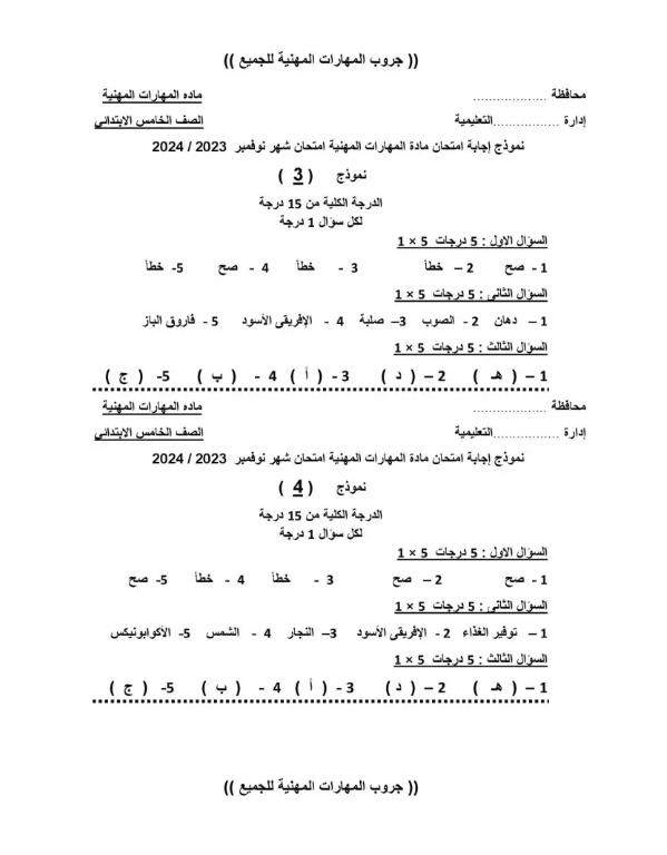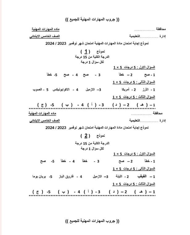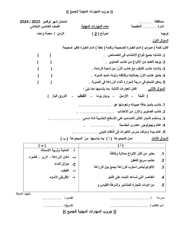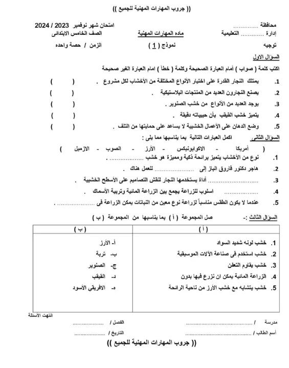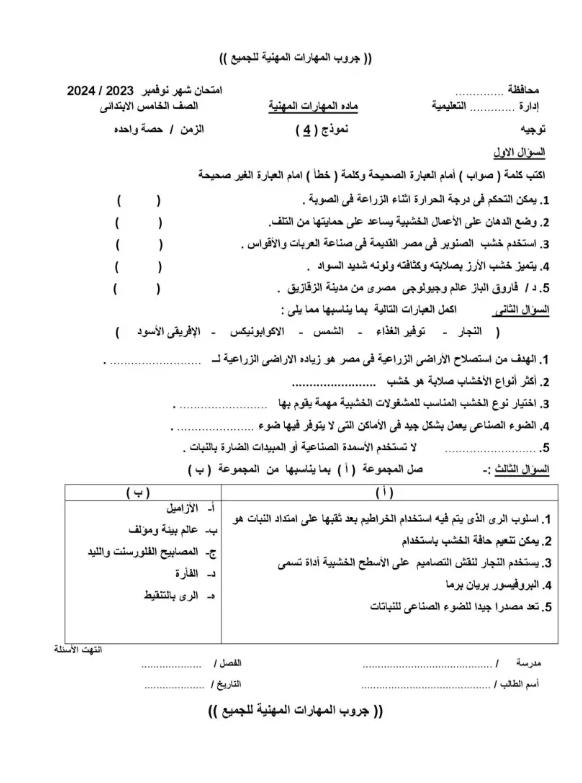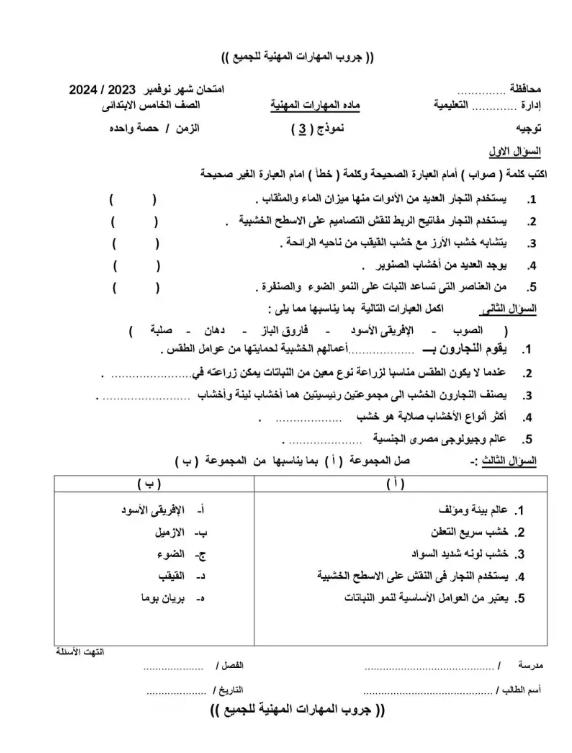 نماذج امتحانات شهر نوفمبر للصف الخامس الابتدائي مهارات مهنية