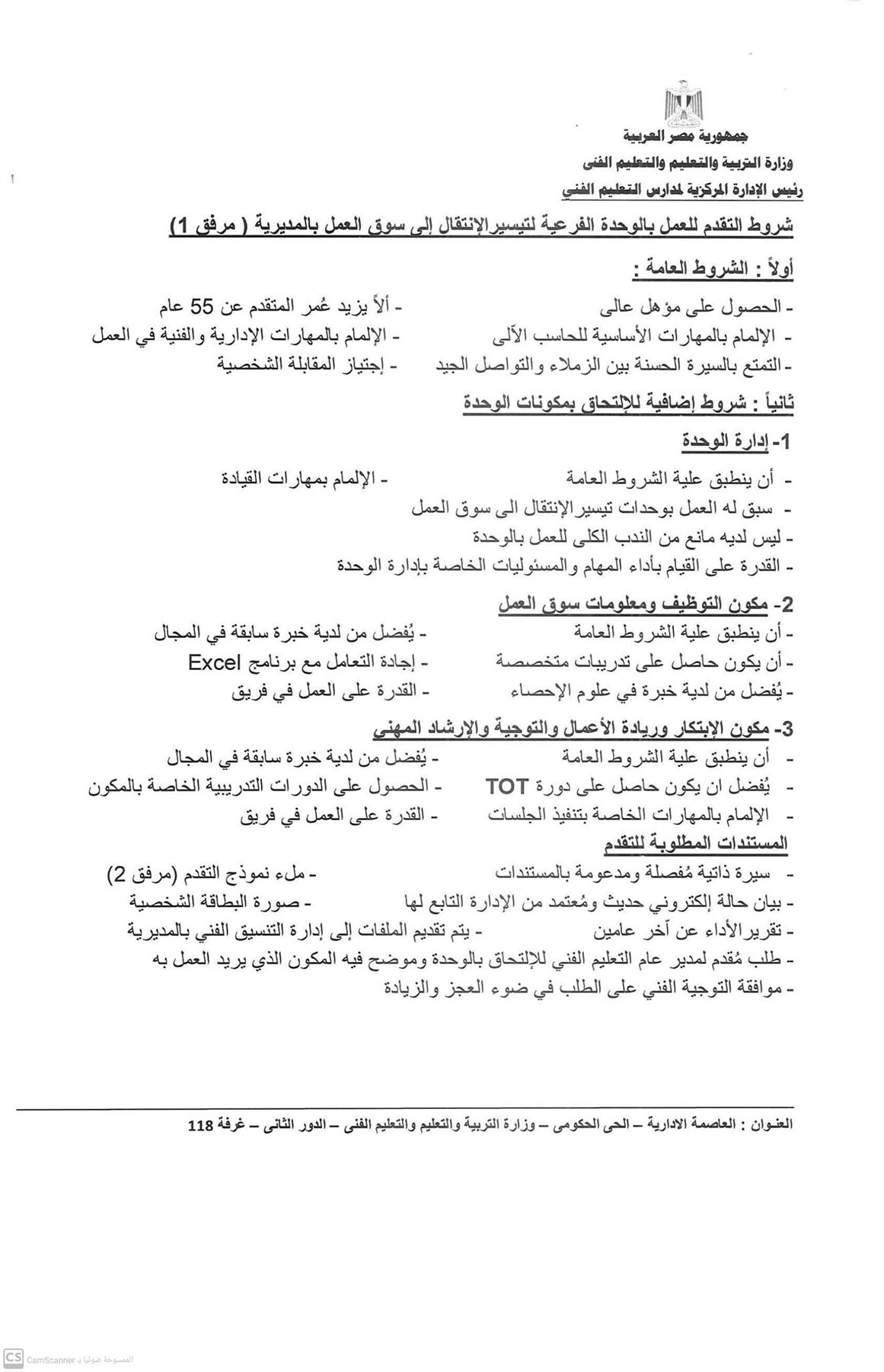 أعلنت الإدارة المركزية لمدارس التعليم الفني بوزارة التربية والتعليم، شروط التقدم للعمل بالوحدة الفرعية لتيسير الانتقال إلى سوق العمل والتي تضمنت الآتي: