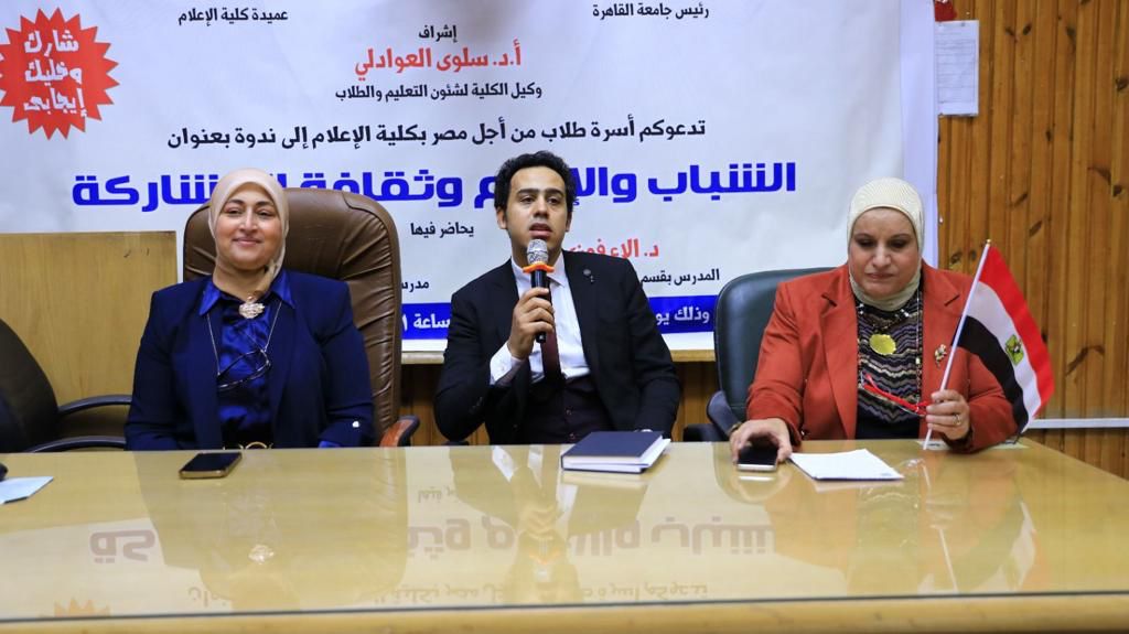 ونظمت كلية الإعلام جامعة القاهرة، ندوة بعنوان "الشباب وثقافة المشاركة"، حاضر فيها أعضاء هيئة تدريس بالجامعة، تناولوا خلالها تعزيز الوعي السياسي لدى الشباب وتحفيزهم نحو الشعور بالمسؤولية الوطنية والمجتمعية.