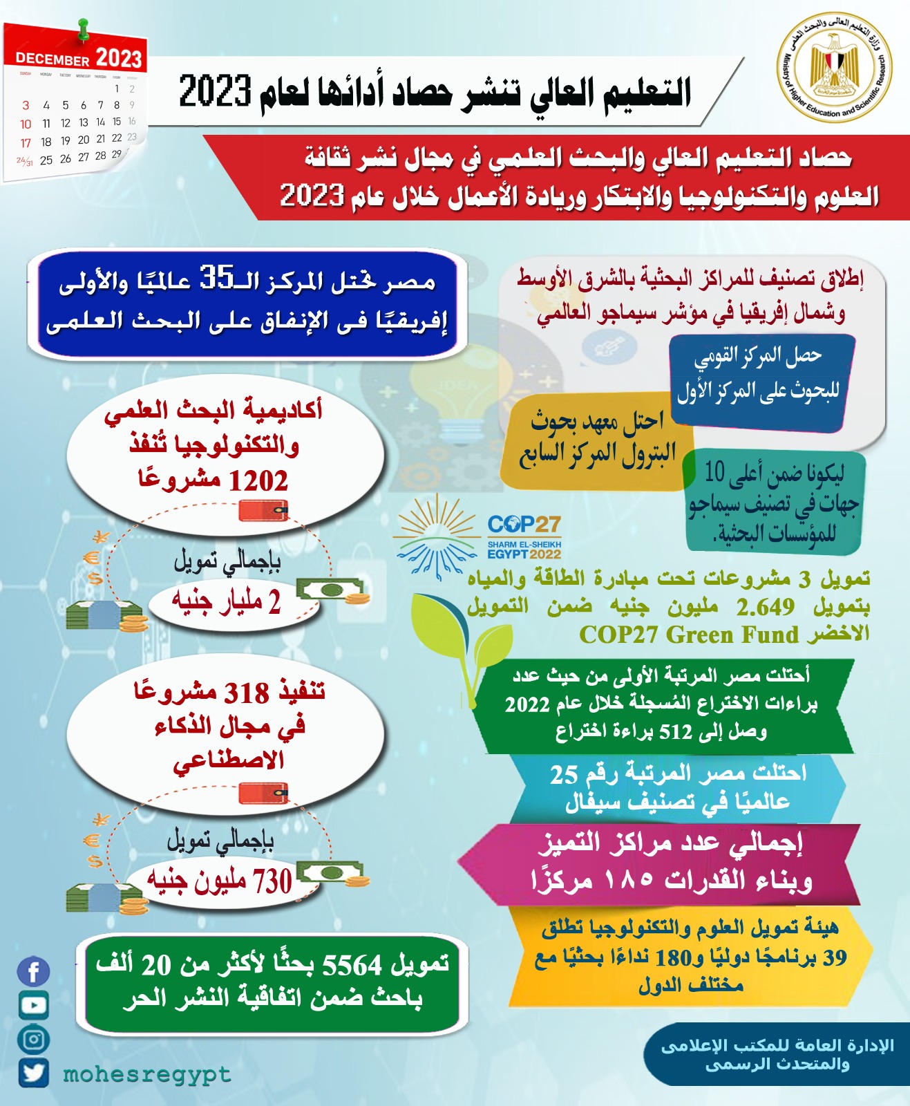 حظى قطاع البحث العلمي بتطورات كبيرة خلال عام 2023، وقامت وزارة التعليم العالي والبحث العلمي بجهود كبيرة لإبراز تلك التطورات والجهود التي قامت بها المراكز والمعاهد والهيئات البحثية في توظيف البحث العلمي لخدمة الاستراتيجية القومية للعلوم والتكنولوجيا والابتكار 2030، وربط البحث العلمي بالصناعة، ودعم الباحثين والمُبتكرين.