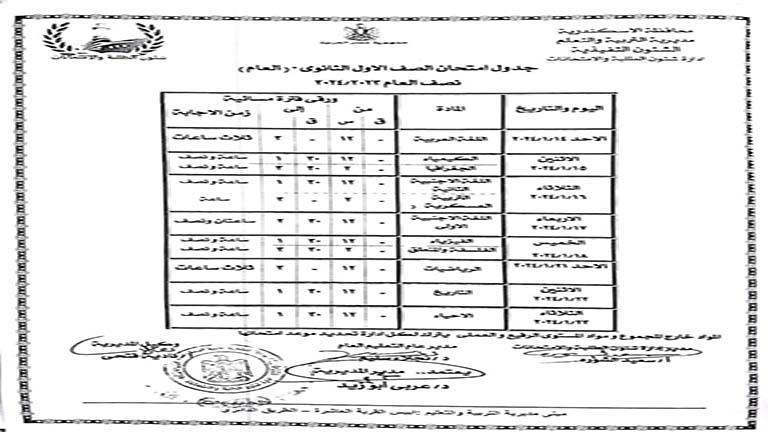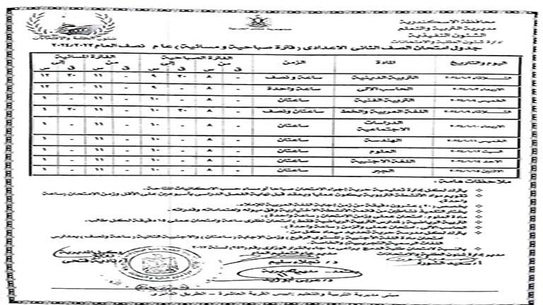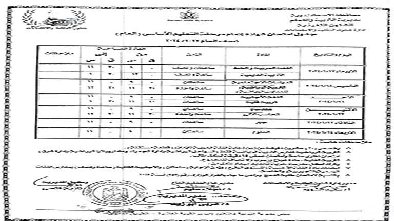 وتبدأ الشهادة الإعدادية (عام- مهني- صم- مكفوفين) من الأربعاء إلى الأربعاء في الفترة 17 يناير إلى 24 يناير 2024، على أن يبدأ الصف الأول والثاني بمرحلة الثانوية العامة من الأحد إلى الأربعاء في الفترة 14 يناير إلى 24 يناير 2024.