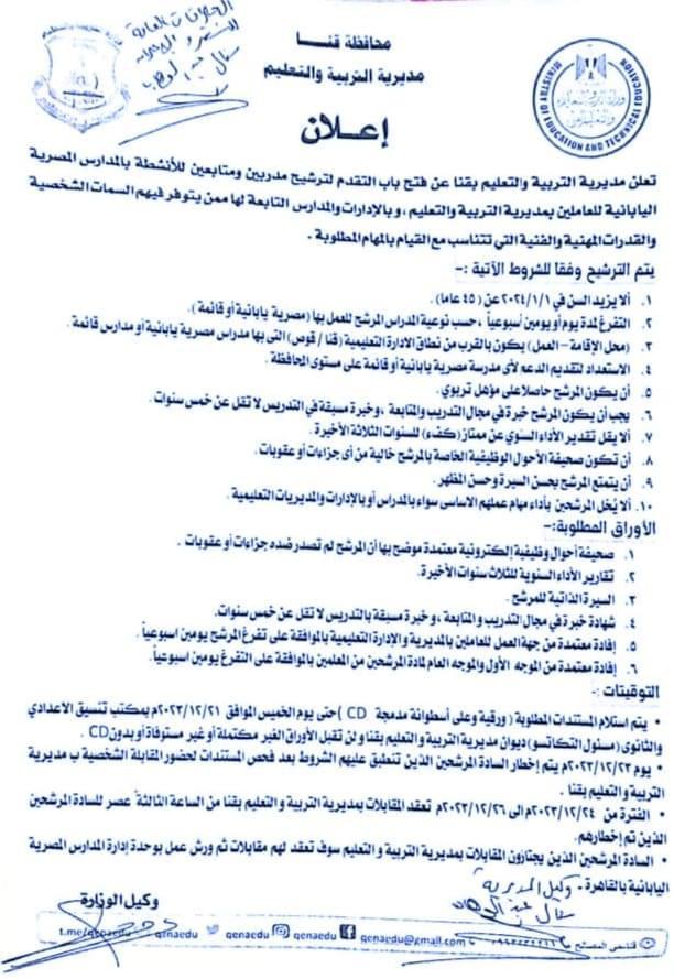 وقالت مديرية التربية والتعليم فى قنا أن شروطها
