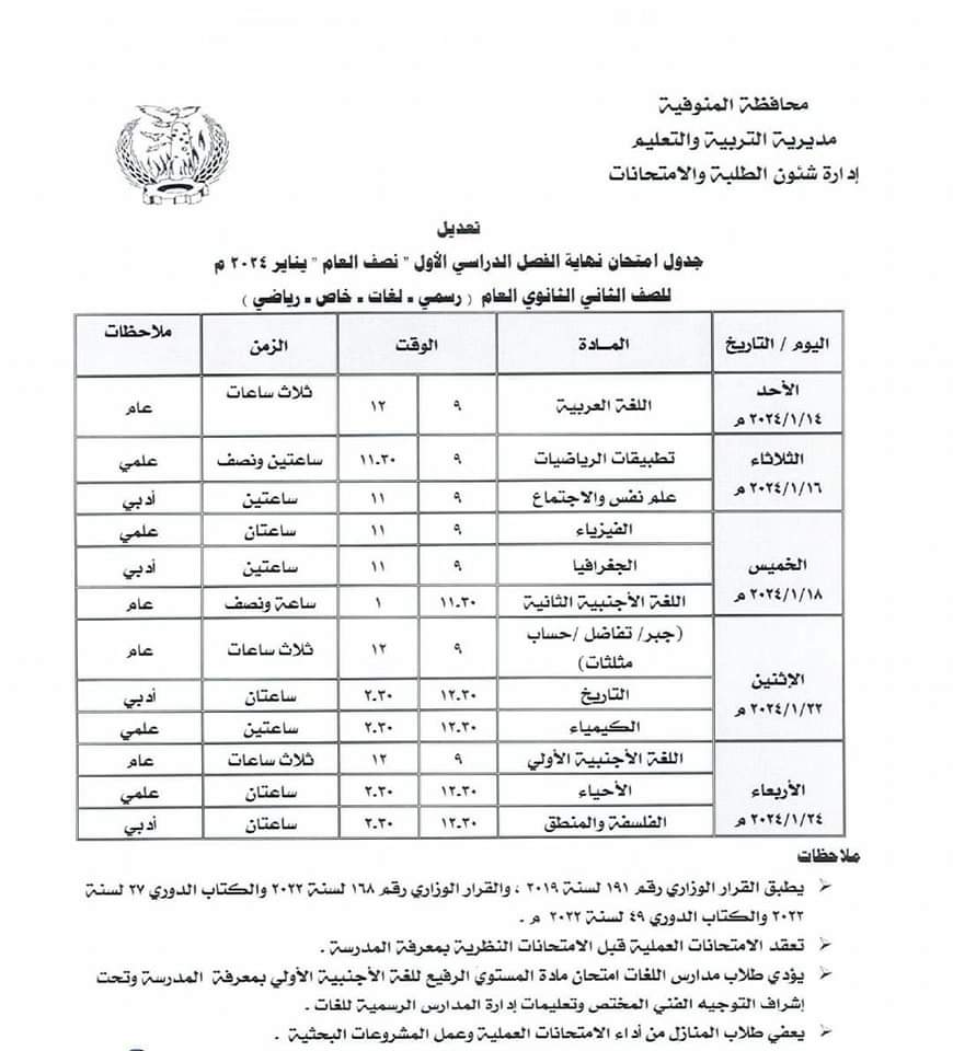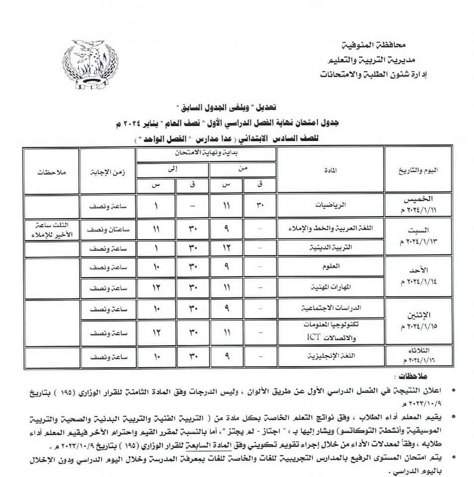عاجل.. تعديل جدول امتحانات السادس الابتدائي والأول والثاني الثانوي بالمنوفية