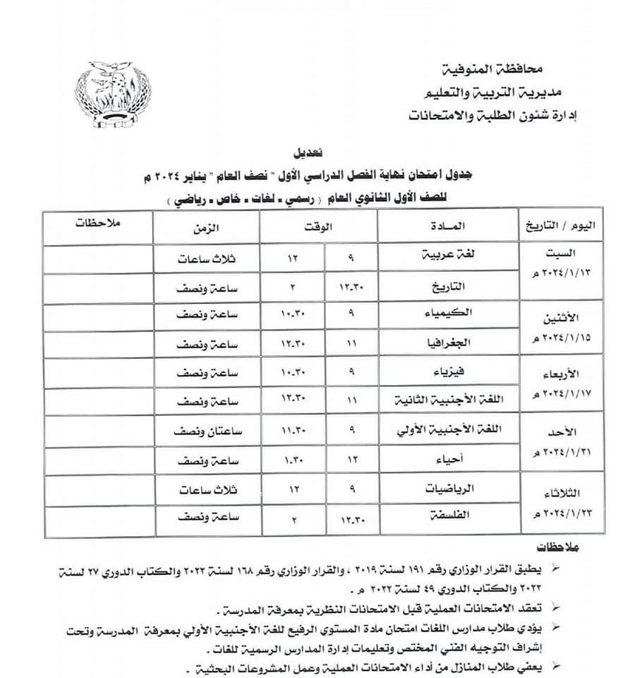قرر محمود الفولي وكيل وزارة التربية والتعليم والتعليم الفني بمحافظة المنوفية، عقب اجتماعه بمديري عموم المديرية ومديري عموم الإدارات التعليمية تعديل جدول الصف السادس الابتدائي والصفين الأول والثاني الثانوي.