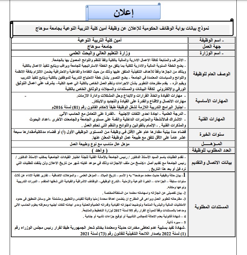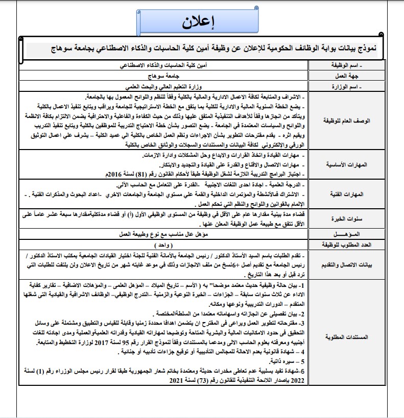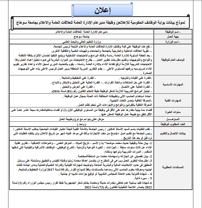 أعلنت جامعة سوهاج عن وظائف قيادية شاغرة لشغل منصب "أمين كلية الحاسبات والذكاء الاصطناعي - مدير عام الإدارة العامة للعلاقات العامة والإعلام - أمين كلية التربية النوعية"، وذلك خلال الفترة من 2023/12/17 حتى 2024/01/16.