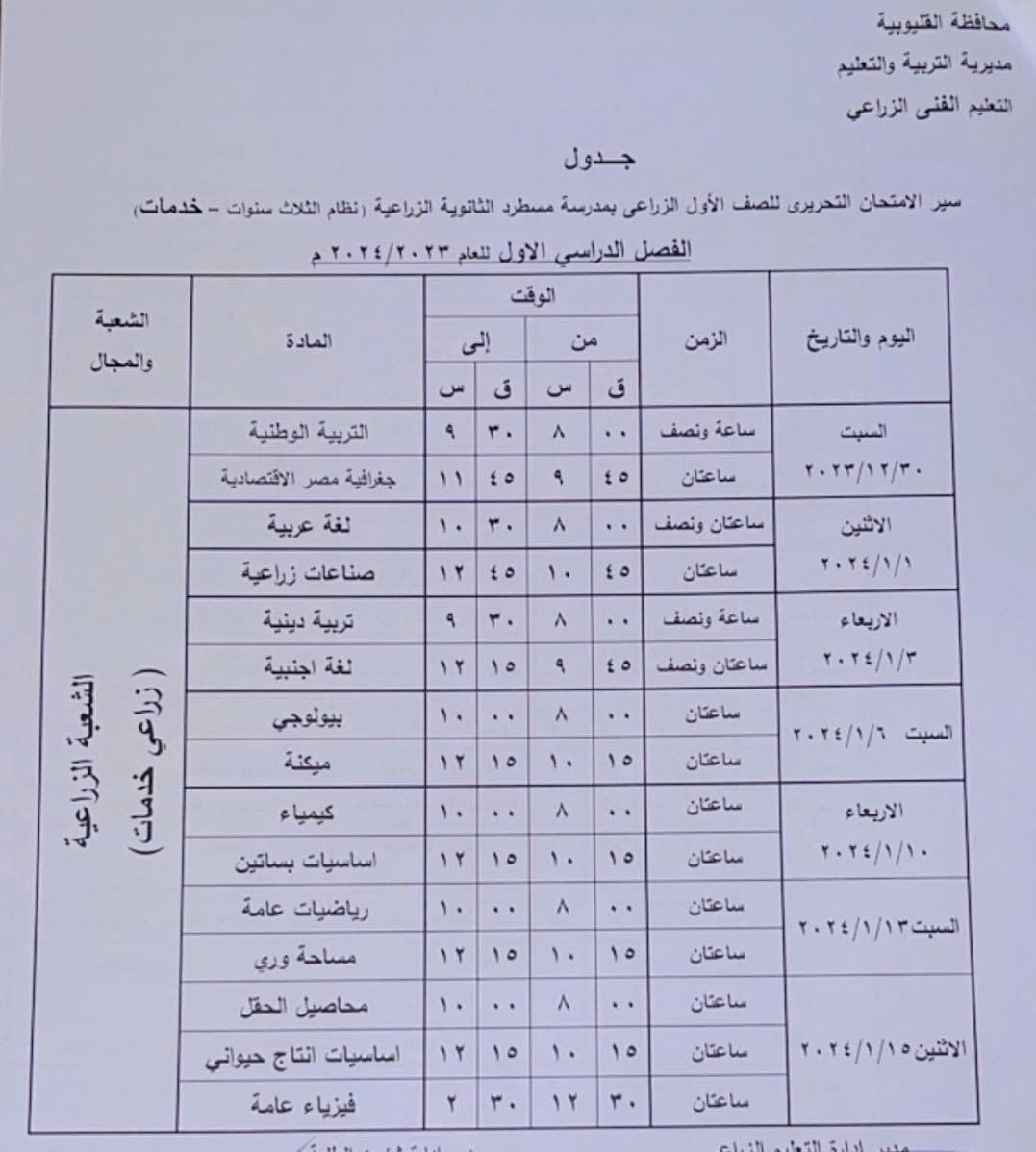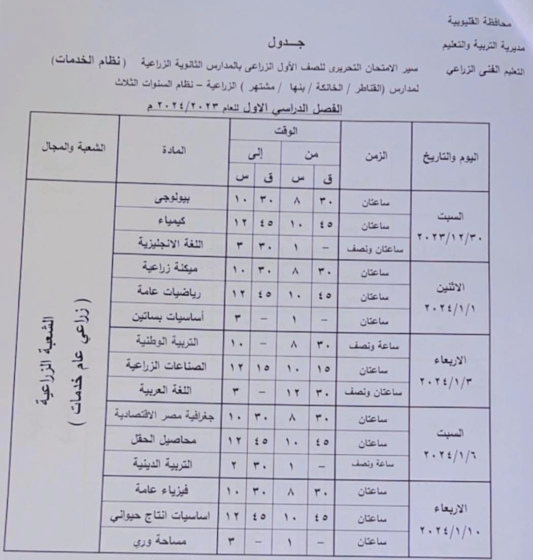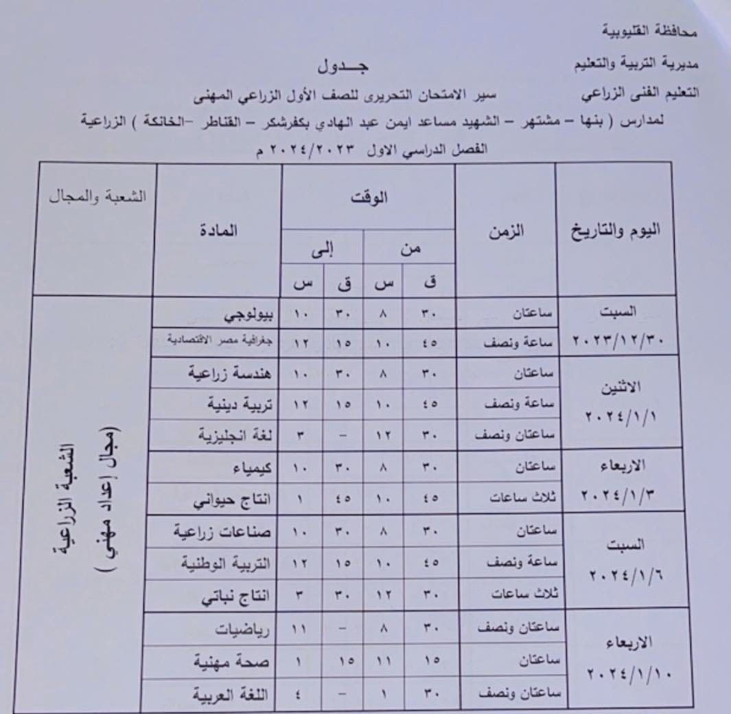 ويعقد يوم السبت الموافق 30 ديسمبر 2023 امتحانات بيولوجي، جغرافية مصر الاقتصادية لطلاب الصف الأول الزراعي المهني لمدارس بنها ومشتهر والشهيد مساعد أيمن عبدالهادي بكفر شكر، القناطر، الخانكة" الزراعية.