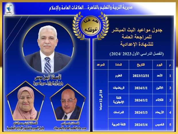 وفي وقت سابق، أعلنت مديرية التربية والتعليم فى القاهرة جدول مواعيد البث المباشر لمراجعة المواد الدراسية للشهادة الإعدادية، وأكد أيمن موسي مدير مديرية التربية والتعليم في القاهرة أن القيادات حريصين على خلق جيل قادر على مواجهة التحديات وصناعة المستقبل.