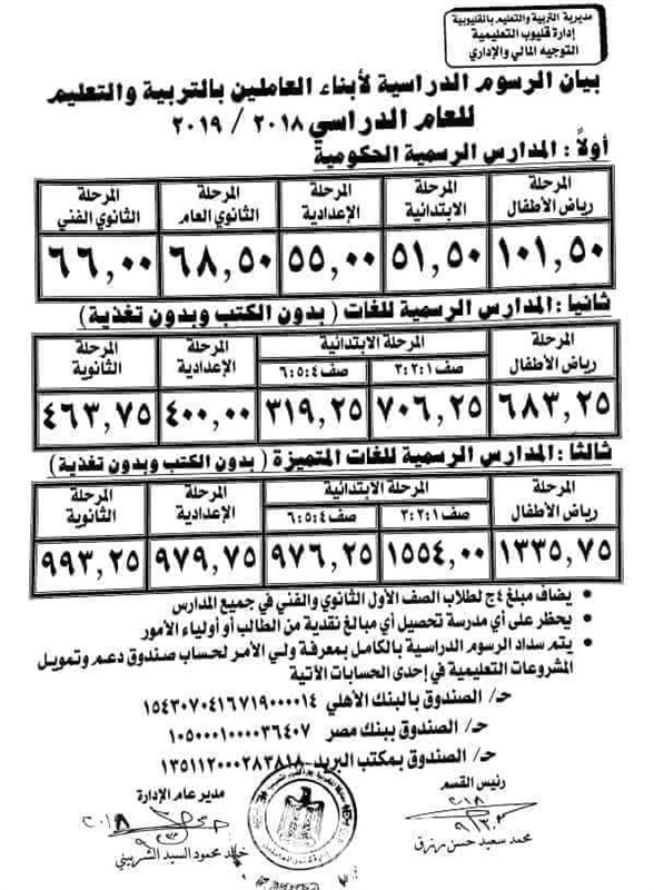 المرحلة الإبتدائية 706 و319، بينما المرحلة الإعدادية 400 جنية أما المرحلة الثانوية 463.