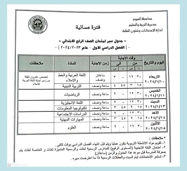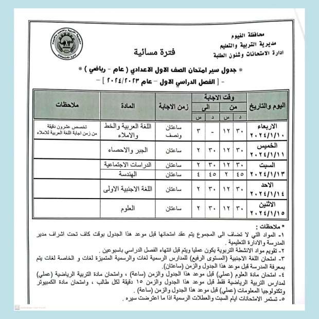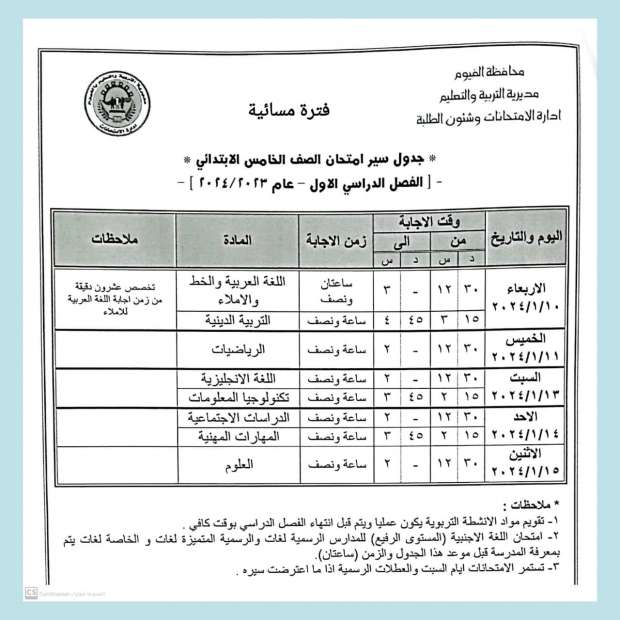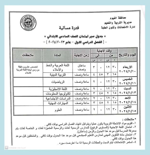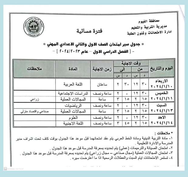 جدول امتحانات الفصل الدراسي الأول 2024 "الفترة المسائية" في الفيوم