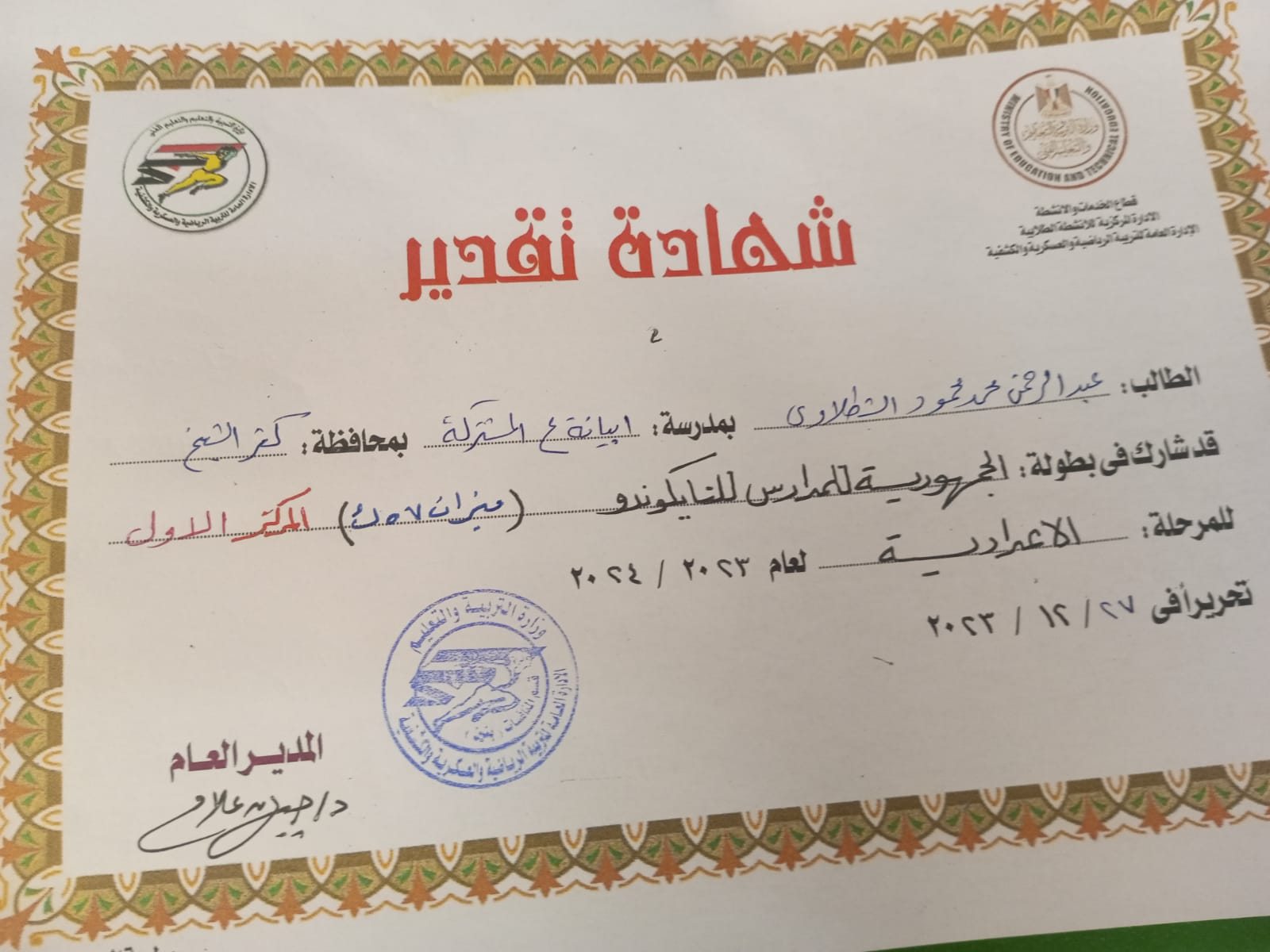 وحصل عبد الرحمن الشطلاوي، على المركز الاول علي مستوي الجمهورية، الطالب بمدرسه ابيانه الاعداديه كما حصل علي المركز الثالث كلامن أحمد باسم، محفوظ العربي الطالبن بمدرسه مطوبس الإعدادية بنين، وحصل الطالب ابراهيم الشربيني علي المركز الثاني بمدرسه معديه مهدي الإبتدائية، كما حصل الطالب عمرو أبوسليمان، على والرابع في البطولة.