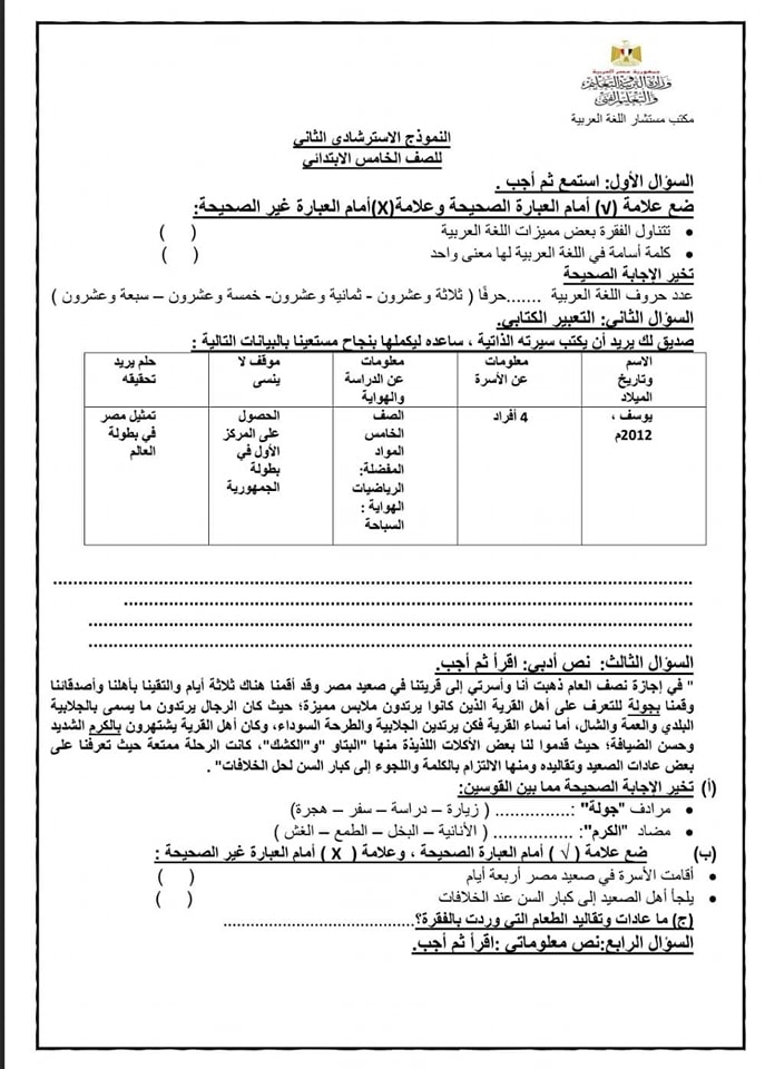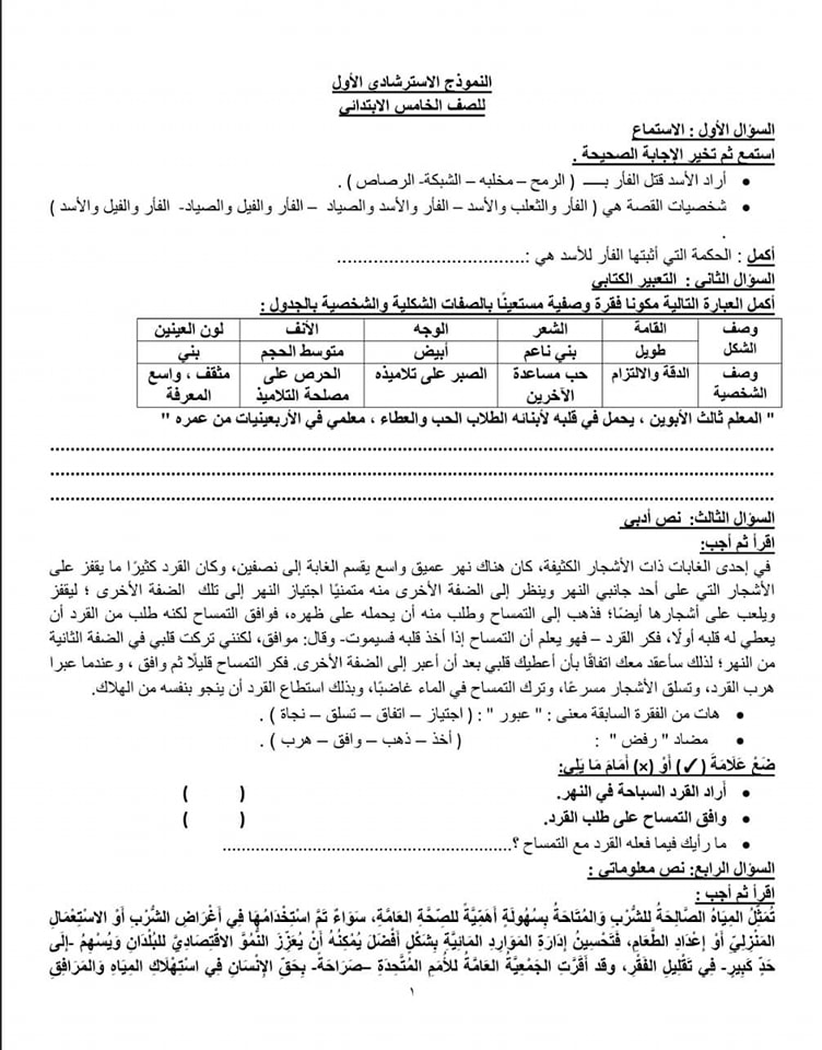 النموذج الاسترشادي لامتحان اللغة العربية للصف الخامس الابتدائي 2024