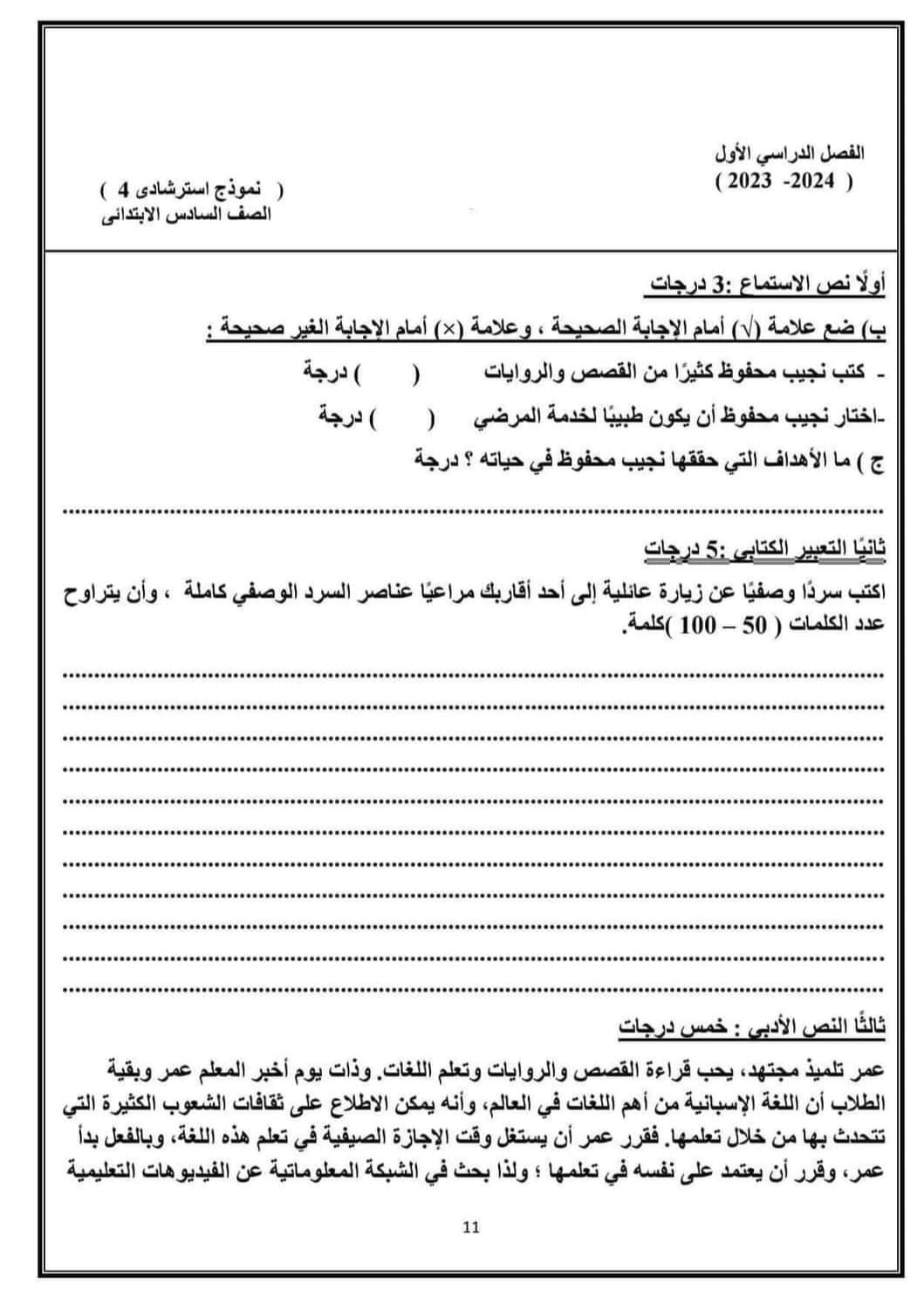 النماذج الاسترشادية لمادة اللغة العربية للسادس الابتدائي 2024 "صور"