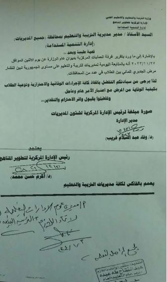 كما شددت وزارة التربية والتعليم والتعليم الفني على اتخاذ كافة الإجراءات الوقائية والاحترازية، وضرورة توعية الطلاب بكيفية الوقاية من العدوى.