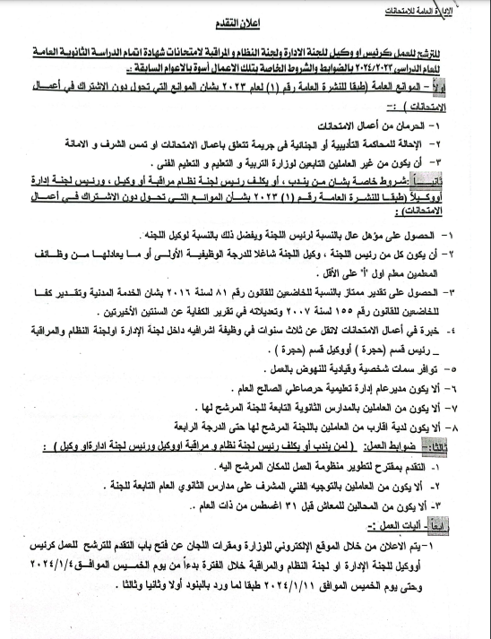 عاجل| آخر موعد للترشح للعمل رئيس أو وكيل لجان النظام والمراقبة بامتحانات الثانوية العامة