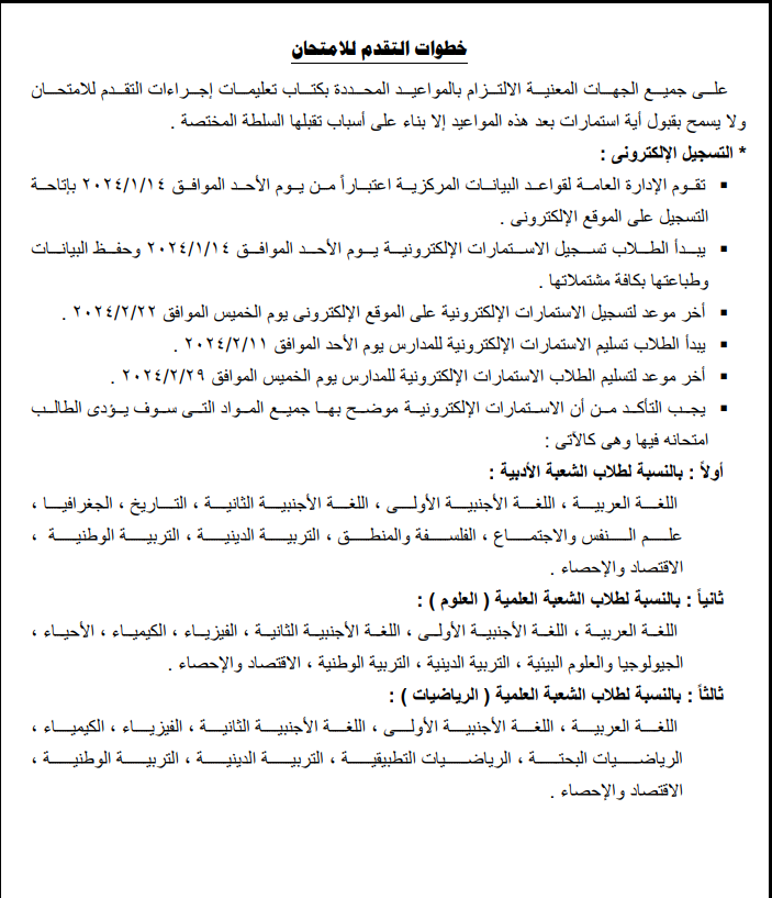 وأشارت إلى أنه لا يسمح بقبول أية استمارات بعد هذه المواعيد إلا بناء على أسباب تقبلها السلطة المختصة، وتقوم الإدارة العامة لقواعد البيانات المركزية اعتبارًا من يوم الأحد الموافق ٢٠٢٤/١/١٤ بإتاحة التسجيل على الموقع لاستمارات الثانوية العامة.
