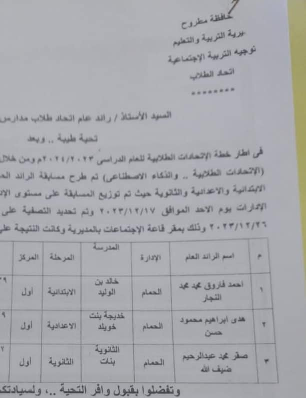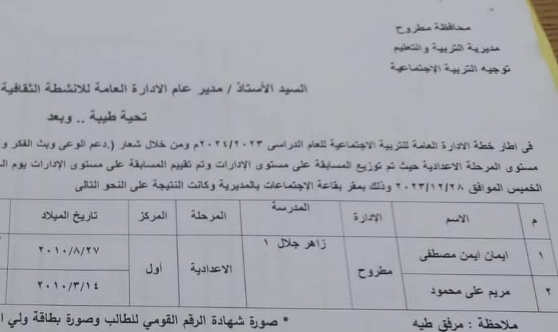 اعتمد كذلك وكيل الوزارة نتيجة مسابقة الوعي القومي للمدارس الإعدادية والتي تم تنظيمها تحت شعار ( دعم الوعي وبث الفكر وغرس القيم السامية للحفاظ علي الهوية ) حيث حققت الطالبتان إيمان أيمن مصطفى ومريم علي محمود بمدرسة زاهر جلال ١ الإعدادية بنات علي المركز الأول علي مستوي مطروح.