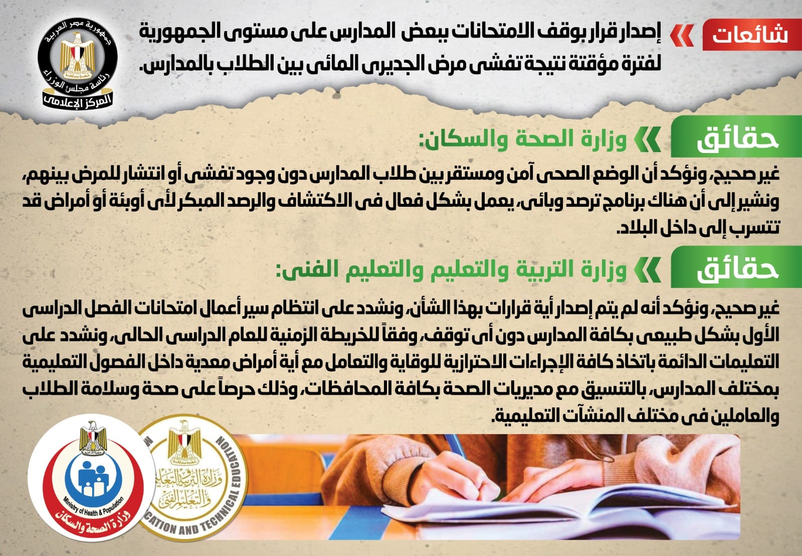 كما أكدت وزارة التربية والتعليم والتعليم الفني، أنه لم يتم إصدار أية قرارات بهذا الشأن، وشددت على انتظام سير أعمال امتحانات الفصل الدراسي الأول بشكل طبيعي بكافة المدارس دون أي توقف، وفقًا للخريطة الزمنية للعام الدراسي الحالي، وشددت على التعليمات الدائمة باتخاذ كافة الإجراءات الاحترازية للوقاية والتعامل مع أية أمراض معدية داخل الفصول التعليمية بمختلف المدارس، بالتنسيق مع مديريات الصحة بكافة المحافظات، وذلك حرصًا على صحة وسلامة الطلاب والعاملين في مختلف المنشآت التعليمية.
