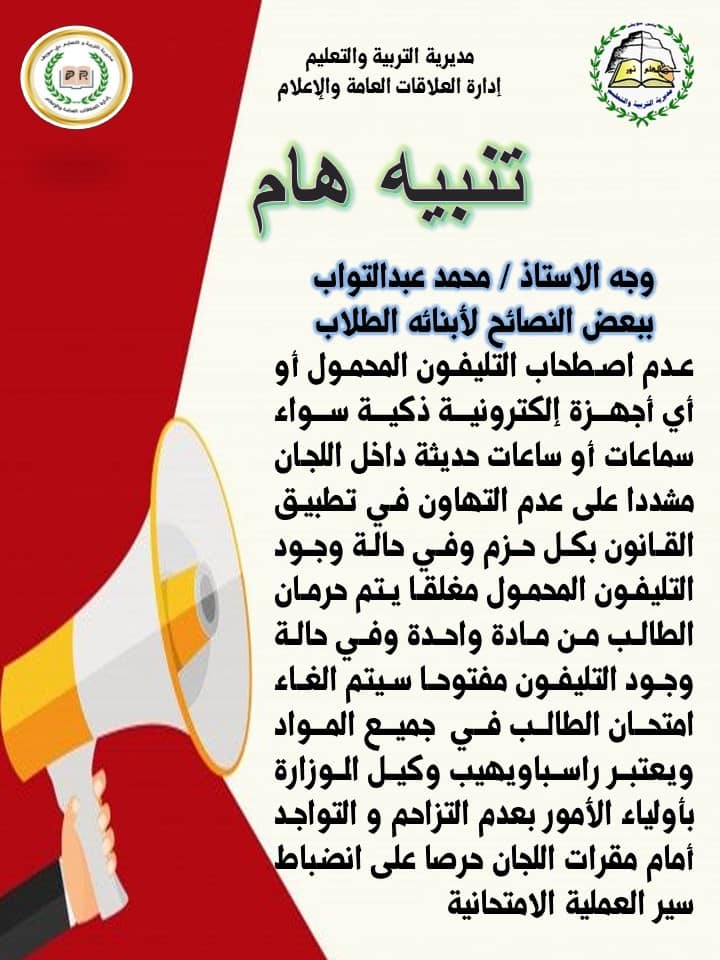 وشدد على عدم التهاون في تطبيق القانون بكل حزم وفي حالة وجود التليفون المحمول مغلقا يتم حرمان الطالب من مادة واحدة وفي حالة وجود التليفون مفتوحا سيتم الغاء امتحان الطالب في جميع المواد ويعتبر راسبا