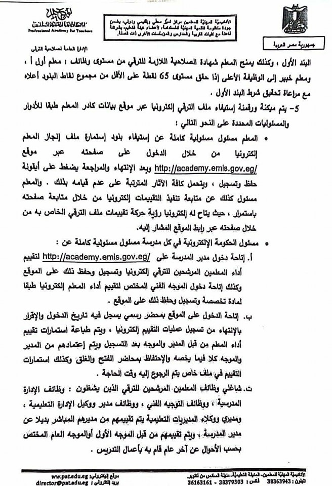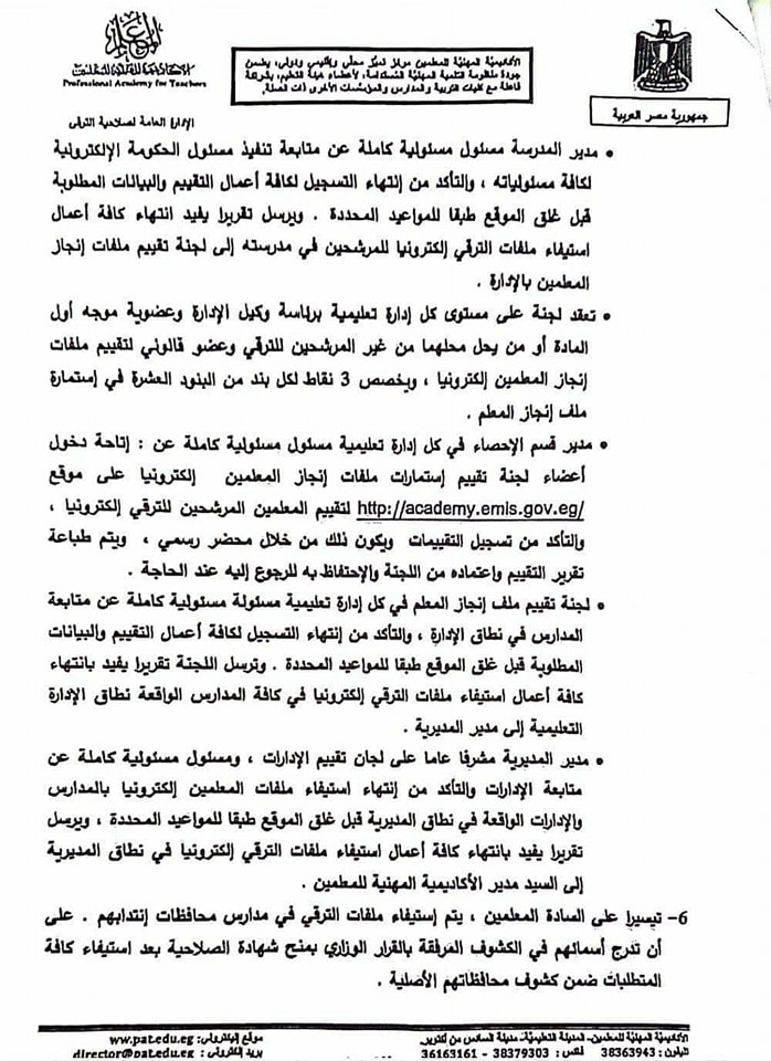 - مسئول الحكومة الإلكترونية في كل مدرسة مسئول مسئولية كاملة عن: ا. إتاحة دخول مدير المدرسة على http://academy.emis.gov.eg لتقييم أداء المعلمين المرشحين للترقي إلكترونيا وتسجيل وحفظ ذلك على الموقع وكذلك إتاحة دخول الموجه الفني المختص لتقييم أداء المعلم الكترونيا طبقا لمادة تخصصة وتسجيل وحفظ ذلك على الموقع.