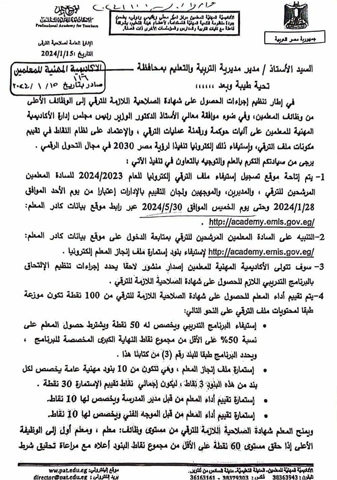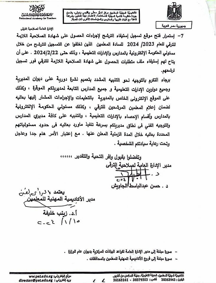 وجهت الأكاديمية المهنية للمعلمين خطاب رسمي للمديريات التعليمية بشأن الحصول على شهادة الصلاحية اللازمة للترقي.