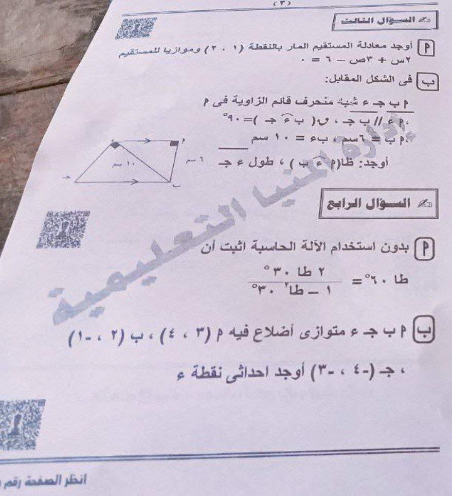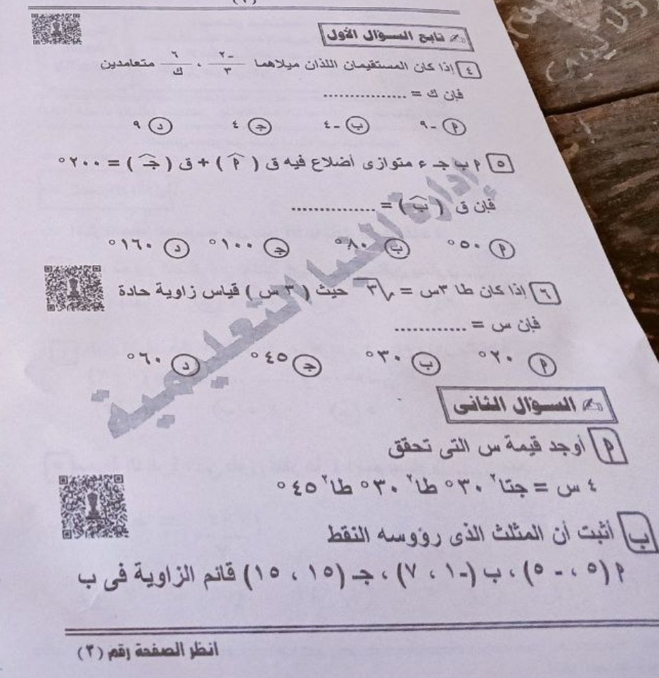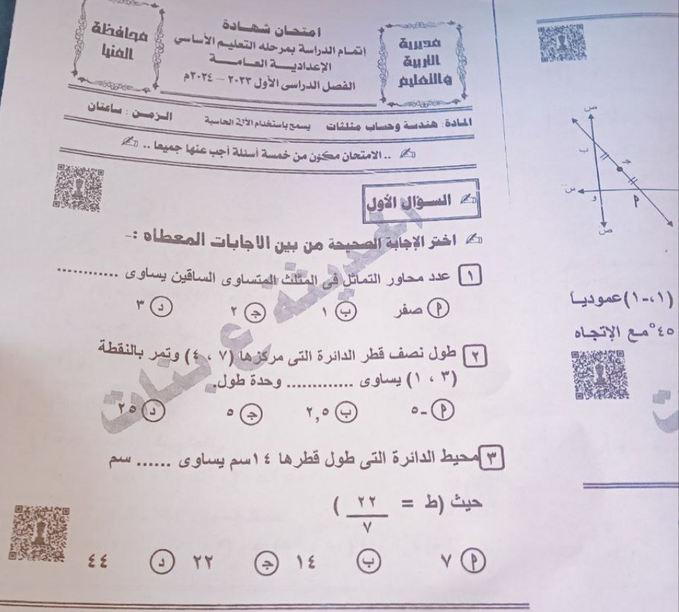 تداول امتحان الهندسة وحساب المثلثات للشهادة الإعدادية بالمنيا على تليجرام «صور»