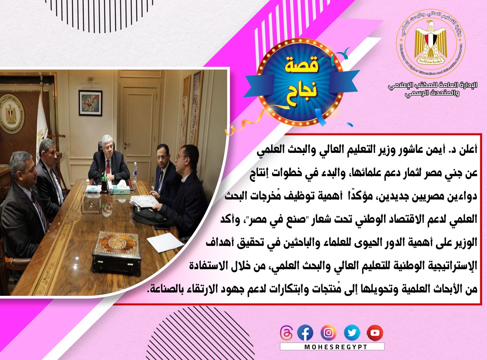 أعلن الدكتور أيمن عاشور وزير التعليم العالي والبحث العلمي، عن جني مصر لثمار دعم علمائها، والبدء في خطوات إنتاج دواءين مصريين جديدين، مؤكدًا أهمية توظيف مخرجات البحث العلمي لدعم الاقتصاد الوطني تحت شعار "صنع في مصر".