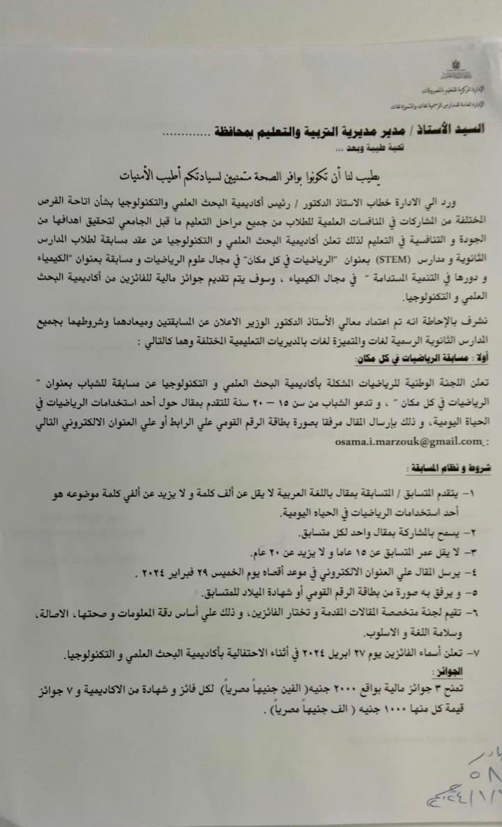 أوضحت الإدارة المركزية للتعليم بالمصروفات بوزارة التربية والتعليم والتعليم الفني، أنه ورد إليها خطاب رئيس أكاديمية البحث العلمي والتكنولوجيا بشأن اتاحة الفرص المختلفة من المشاركات في المنافسات العلمية للطلاب من جميع مراحل التعليم ما قبل الجامعي لتحقيق أهدافها من الجودة والتنافسية في التعليم.