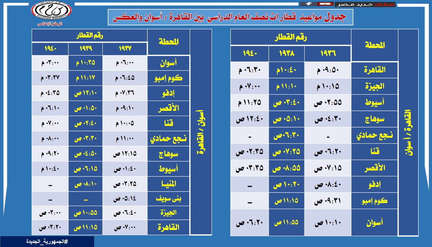 اعتبارا من يوم 24/1/2024 يتم تشغيل قطار 1936 ( مكيف ) القاهرة / أسوان يقوم من القاهرة الساعة 09:50 مساءًا ويصل أسوان الساعة 10:10 صباحًا، وقطار 1938( ثالثة مكيفة ) يقوم من القاهرة الساعة 10:40 مساءًا ويصل أسوان الساعة 11:55 صباحًا، وقطار 1940 ( ثالثة مكيفة ) القاهرة / أسوان يقوم من القاهرة الساعة 06:30 مساءًا ويصل أسوان الساعة 06:20 صباحًا طبقًا للجداول المرفقة.