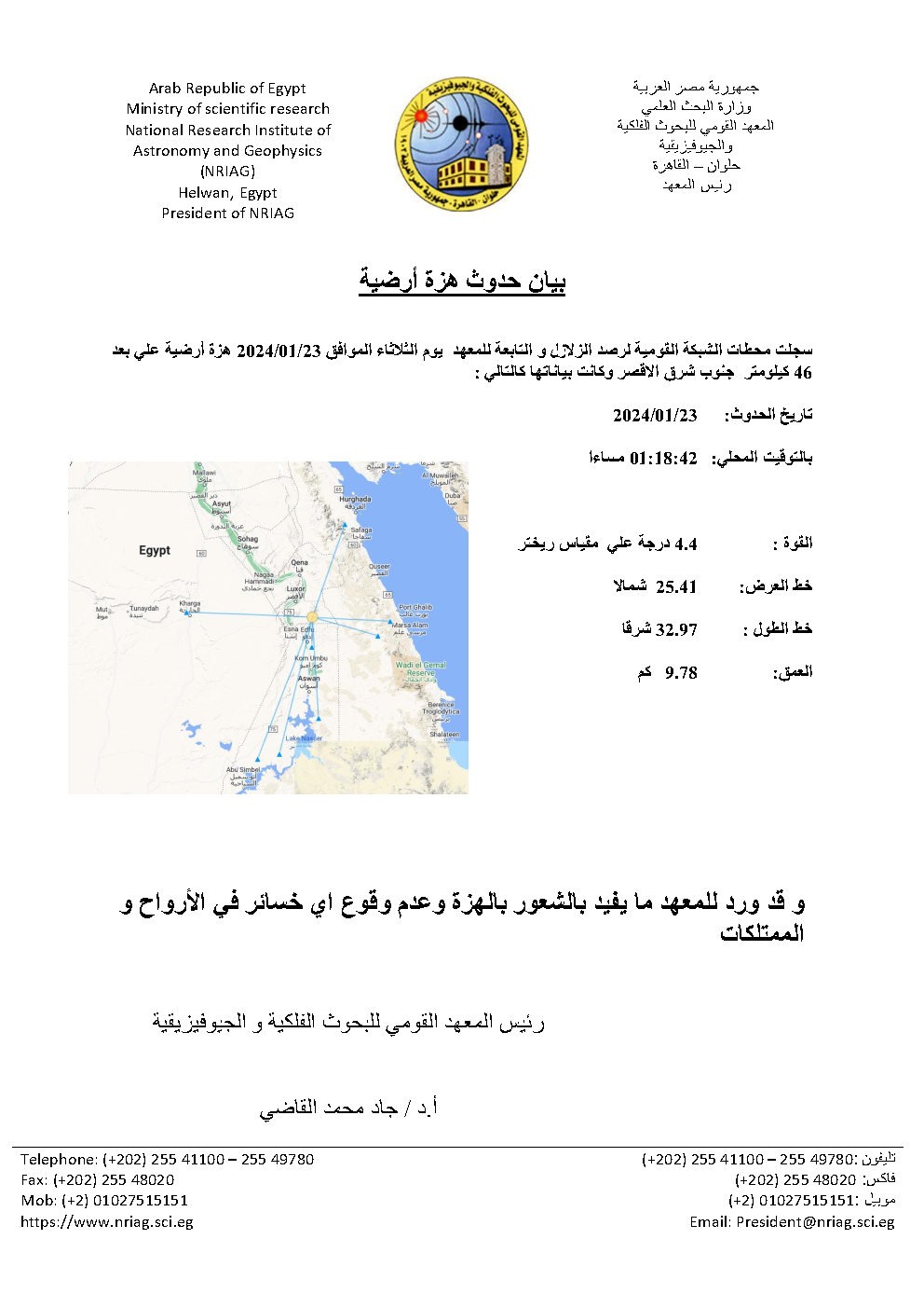 قال الدكتور جاد القاضي، رئيس المعهد القومي للبحوث الفلكية إن محطات الشبكة القومية للزلازل سجلت هزة أرضية بقوة اعلى من 4.5 درجة على مقايس ريختر شرق الأقصر وجار تحليل بياناتها.
