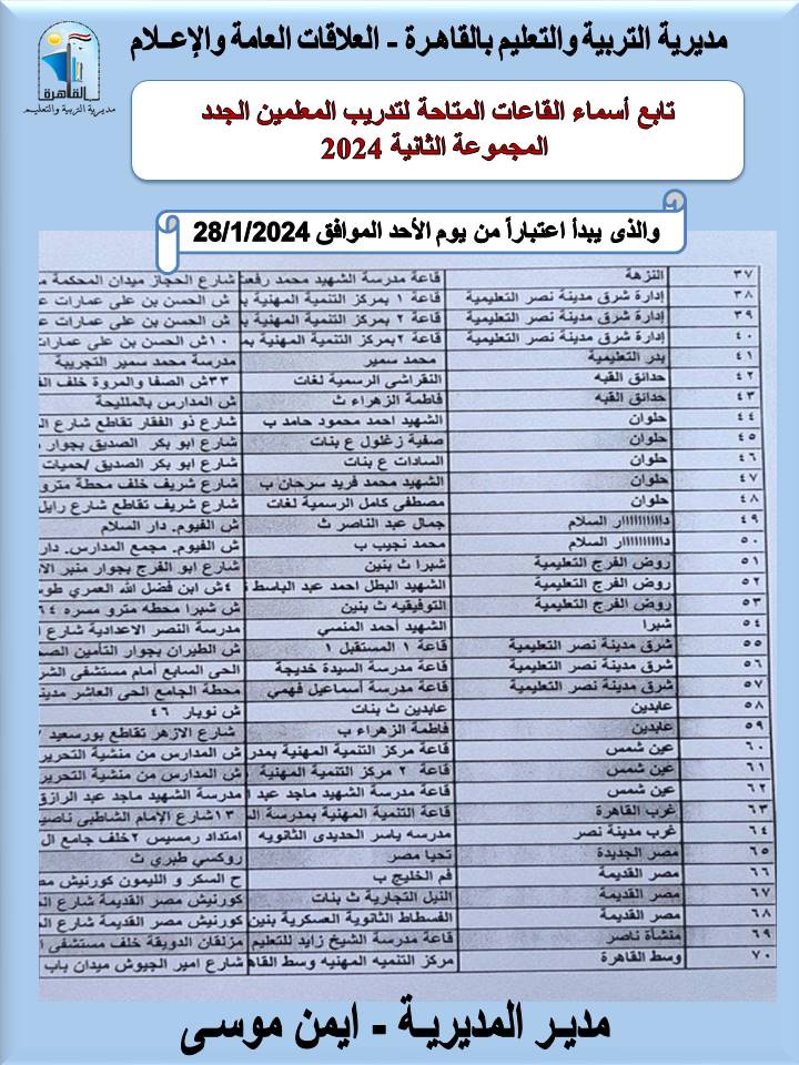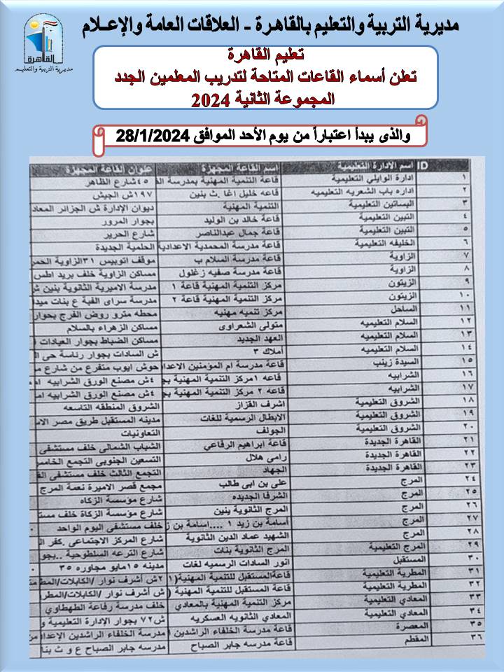 أماكن القاعات المتاحة لتدريب المجموعة الثانية للمعلمين الجدد في القاهرة