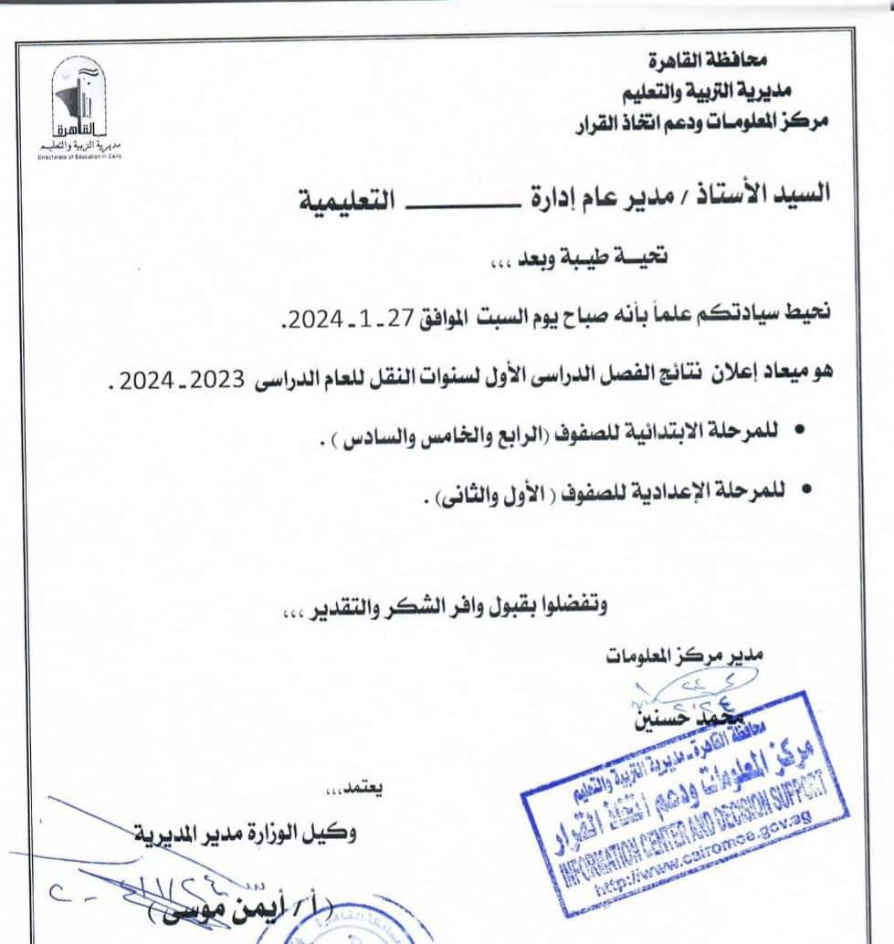 أعلنت مديرية التربية والتعليم والتعليم الفني بمحافظة القاهرة عن موعد إعلان نتيجة امتحانات صفوف النقل الفصل الدراسي الأول العام الدراسي الحالي 2023 - 2024.