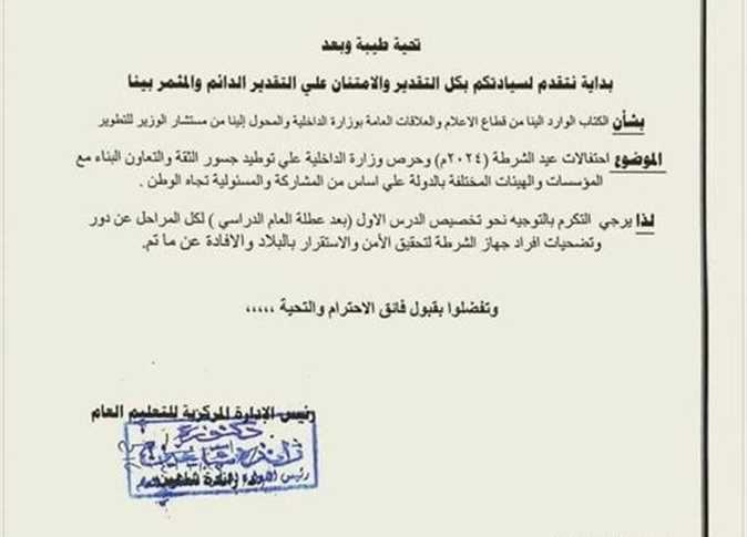 وجهت وزارة التربية والتعليم والتعليم الفني، خطابا لجميع المديريات التعليمية بالمحافظات، شددت خلاله على ضرورة توجيه المدارس «رياض الأطفال- التعليم الابتدائي- الإعدادي- الثانوي الموهوبين التربية الخاصة» بتخصيص الدرس الأول بعد عطلة العام الدراسي، بداية الفصل الدراسي الثاني 2024 لكل المراحل عن دور وتضحيات أفراد جهاز الشرطة لتحقيق الأمن والاستقرار بالبلاد والإفادة عن ما تم.