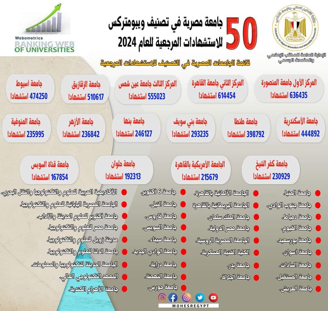 كما أشارت إلى اعتماد التصنيف الإسباني ويبومتركس للاستشهادات المرجعية على المواقع الإلكترونية للجامعات، ومعدل الاستشهادات بالأبحاث العلمية المنشورة دوليًا، معتمدًا على جوجل أسكولر (Google scholar) للاستشهادات بالبحوث العالمية.