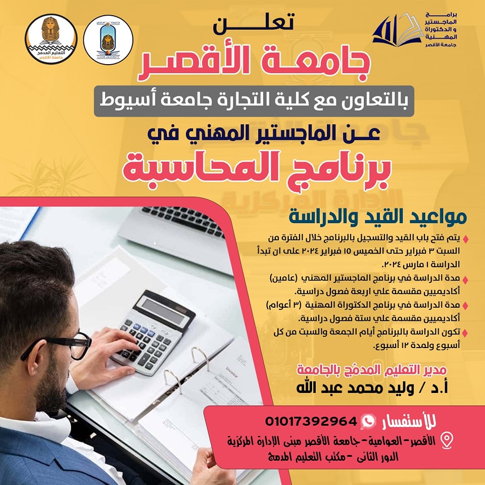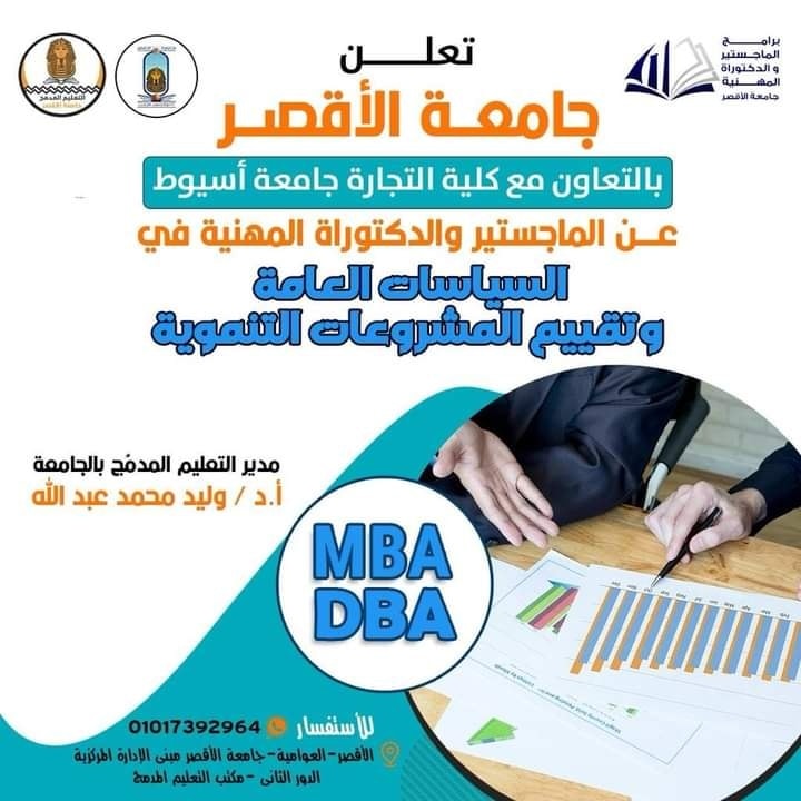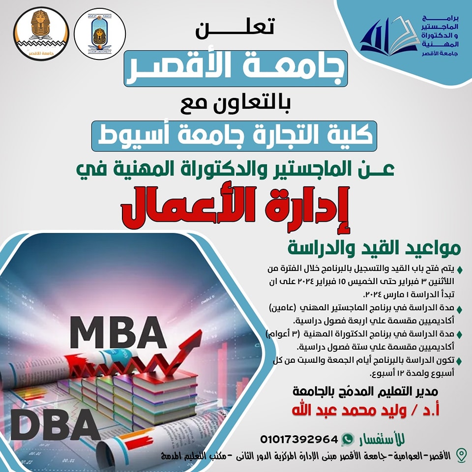 ومن جانبه قال الدكتور وليد محمد عبدالله مدير التعليم المدمج بجامعة الأقصر، إنه يعلن مركز التعليم المدمج بجامعة الأقصر، بالشراكة مع كلية التجارة بجامعة أسيوط، عن فتح باب التقديم في برامج الماجستير والدكتوراه المهنية " MBA" و"DBA" في البرامج التالية: (المحاسبة - السياسات العامة - إدارة الأعمال - التأمين وإدارة المخاطر - إدارة الخدمات الصحية والمستشفيات)، وذلك إبتداءًا من يوم السبت الموافق 3 فبراير حتى يوم الخميس 15 فبراير، وعلى أن تبدأ الدراسة في 1 مارس 2024.