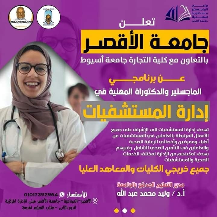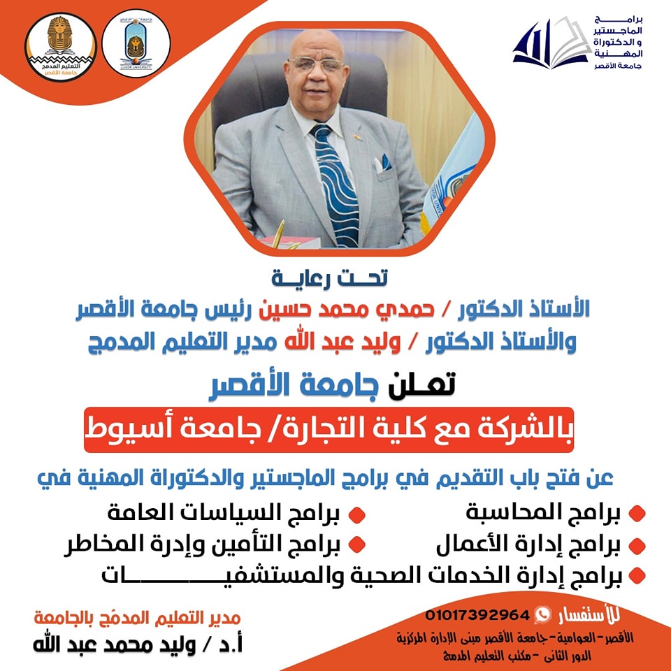أعلنت جامعة الأقصر بقيادة الدكتور حمدي محمد حسين رئيس الجامعة، لأول مرة عن فتح باب التقديم في برامج الماجستير والدكتوراه المهنية في 5 برامج بجامعة الأقصر بالشراكة مع كلية تجارة جامعة أسيوط، وفي البرامج التالية: (المحاسبة - السياسات العامة - إدارة الأعمال - التأمين وإدارة المخاطر - إدارة الخدمات الصحية والمستشفيات).