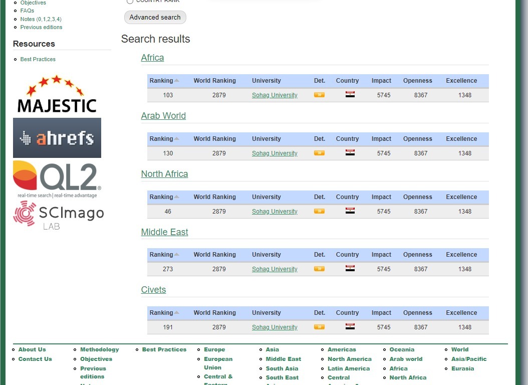 وأضاف رئيس جامعة سوهاج، أنه وفقًا لهذا التصنيف تقدمت الجامعة إفريقيًا أكثر من 14 مركز ليقفز ترتيب الجامعة على مستوى إفريقيا إلى المرتبة 103، وعلى مستوى الجامعات المصرية احتلت الجامعة الترتيب رقم 25 بتقدم مركزين عن شهر يوليو للعام الماضي، موضحًا أن تصنيف ويبوميتركس هو مبادرة من مؤسسة cybermetrics Lab، وهى تابعة لـ(CSIC) وتعتبر من أهم الهيئات البحثية في إسبانيا.