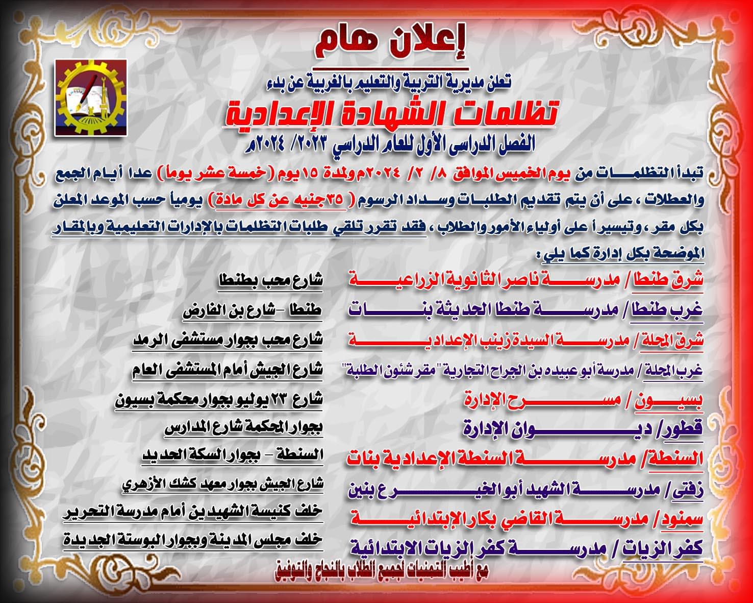 تنفيذا لتوجيهات الأستاذ الدكتور رضا حجازي، وزير التربية والتعليم والتعليم الفني، والأستاذ الدكتور طارق رحمي، محافظ الغربية، صرح ناصر حسن، وكيل وزارة التربية والتعليم بالغربية، أن تظلمات الشهادة الإعدادية للنصف الأول من العام الدراسي 2023 / 2024 ستبدأ يوم الخميس القادم الموافق الثامن من فبراير الحالي، وتستمر لمدة خمسة عشر يومًا.